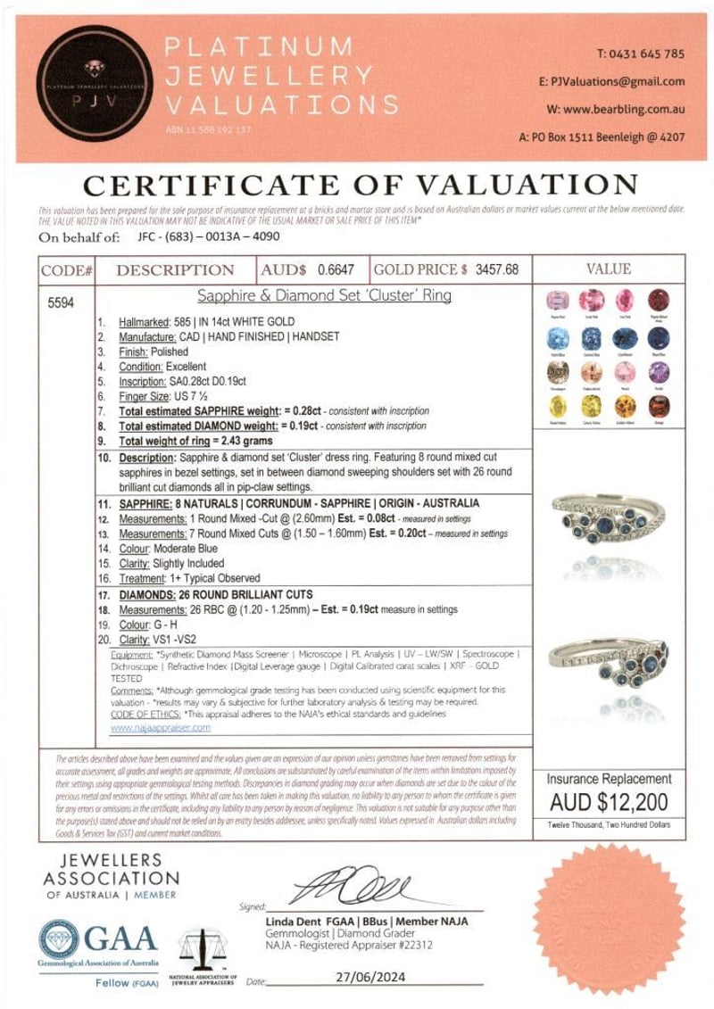 14CT WHITE GOLD AUSTRALIAN SAPPHIRE AND DIAMOND DRESS RING Featuring, 8 Round Cut, Moderate Blue Australian Sapphires (0.28Ct, Slightly Included), Bezel Set, With 26 Round Brilliant Cut Diamonds (0.19Ct Tdw, G-H Colour, Vs1-Vs2 Clarity), Pip Claw. Ring Size O. Valuations Provided by an Independent Third-Party Professional Not Directly Associated With Lloyds Auctions at AUD $12200This valuation has been conducted by an independent third-party professional. The valuation amount is an assessment by the issuing valuer and does not reflect the auction value of the item. Any inquiries regarding the valuation should be directed to the issuing valuer (refer to contact details on the certificate), as Lloyds Auctions has no affiliation or influence over the valuation, the valuer, or the stated amount. Condition: Good - Refer Images 0582871+1923
