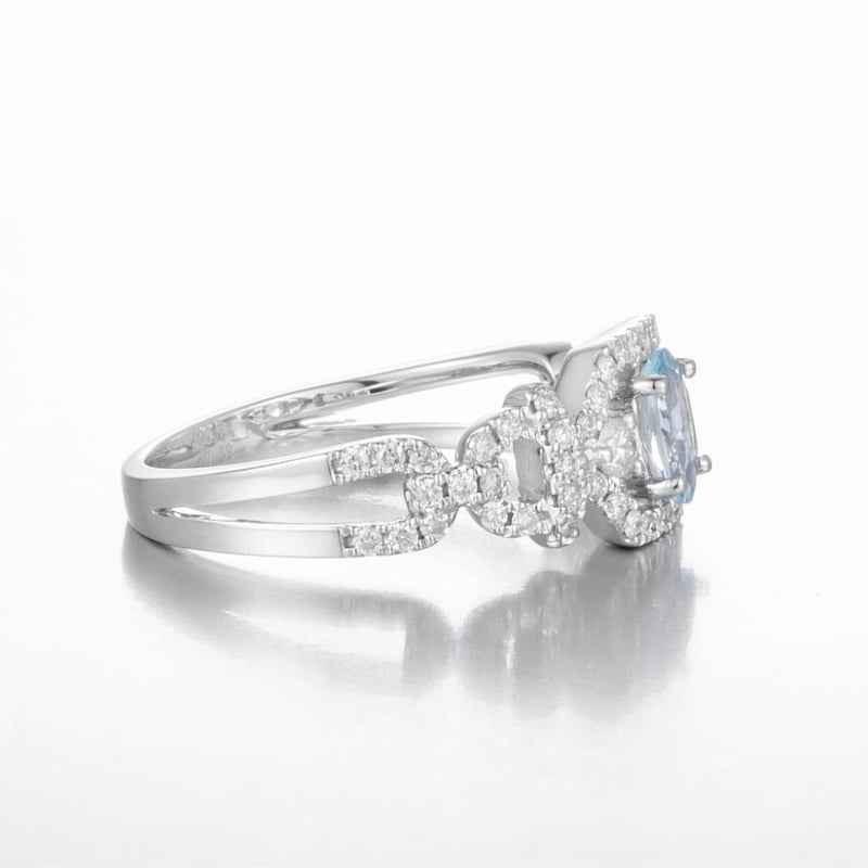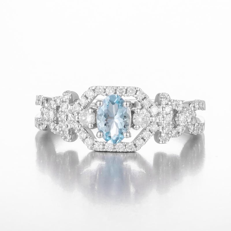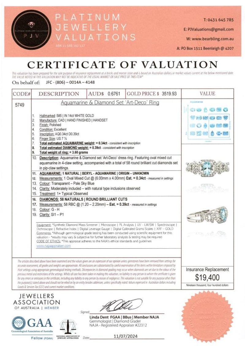 14CT WHITE GOLD AQUAMARINE AND DIAMOND DRESS RING Featuring Centre, One Oval Cut, Pale Sky Blue Aquamarine (0.34Ct Moderately Included), Claw Set, With 58 Round Brilliant Cut Diamonds (0.39Ct Tdw, G-H Colour, Si1-P1 Clarity), Bead Set. Ring Size O. Valuations Provided by an Independent Third-Party Professional Not Directly Associated With Lloyds Auctions at AUD $19400This valuation has been conducted by an independent third-party professional. The valuation amount is an assessment by the issuing valuer and does not reflect the auction value of the item. Any inquiries regarding the valuation should be directed to the issuing valuer (refer to contact details on the certificate), as Lloyds Auctions has no affiliation or influence over the valuation, the valuer, or the stated amount. Condition: Good - Refer Images 0582871+1931