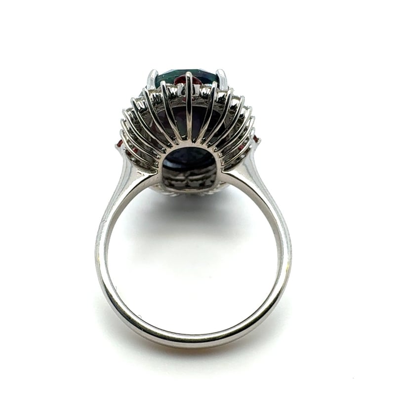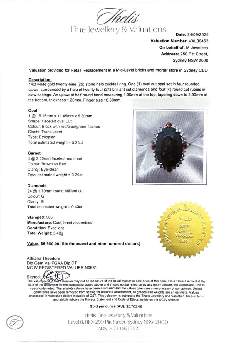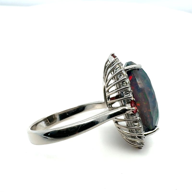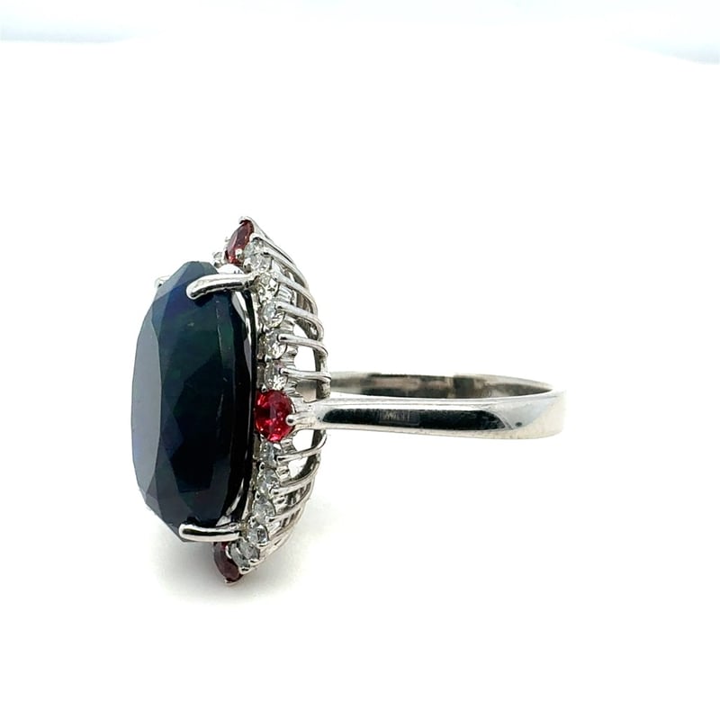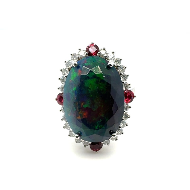 14CT WHITE GOLD OVAL CUT ETHIOPIAN OPAL, GARNET AND DIAMOND RING