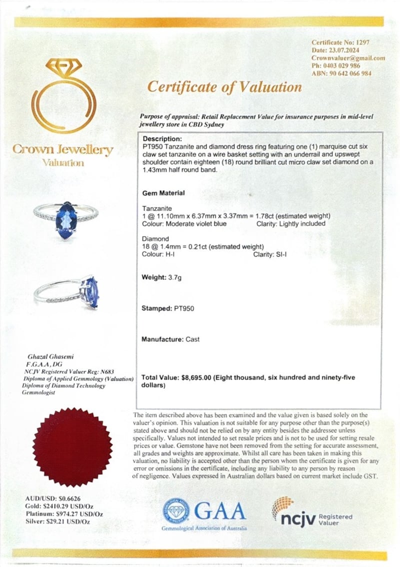 PT950 MARQUISE CUT TANZANITE AND DIAMOND RINGT = 1.78Ct D = 0.21CtVal #1297Condition: Good - Refer To ImagesThis valuation has been conducted by an independent third-party professional. The valuation amount is an assessment by the issuing valuer and does not reflect the auction value of the item.Any inquiries regarding the valuation should be directed to the issuing valuer (refer to contact details on the certificate), as Lloyds Auctions has no affiliation or influence over the valuation, the valuer, or the stated amount.Insurance Replacement Valuation Amount: $8,695.00488487+21