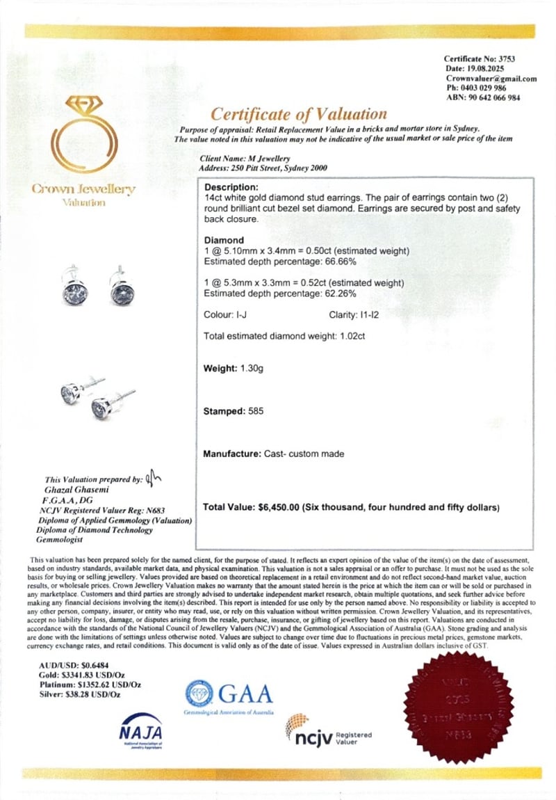 14CT WHITE GOLD ROUND BRILLIANT CUT DIAMOND STUD EARRINGSD = 1.02CtVal #3753Condition: Good - Refer To ImagesThis valuation has been conducted by an independent third-party professional. The valuation amount is an assessment by the issuing valuer and does not reflect the auction value of the item.Any inquiries regarding the valuation should be directed to the issuing valuer (refer to contact details on the certificate), as Lloyds Auctions has no affiliation or influence over the valuation, the valuer, or the stated amount.Insurance Replacement Valuation Amount: $6,450.00488487+47