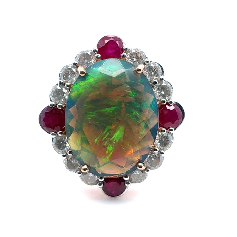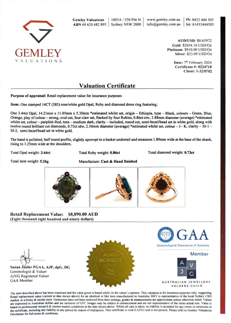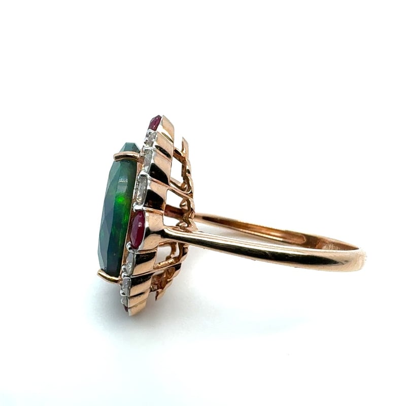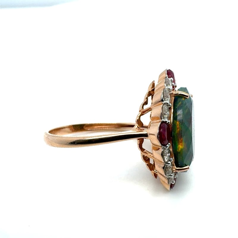 14CT ROSE/WHITE GOLD OVAL CUT OPAL, RUBY AND DIAMOND RINGO = 3.44CtR = 0.86CtD = 0.73CtVal #0224718Condition: Good - Refer To ImagesThis valuation has been conducted by an independent third-party professional. The valuation amount is an assessment by the issuing valuer and does not reflect the auction value of the item.Any inquiries regarding the valuation should be directed to the issuing valuer (refer to contact details on the certificate), as Lloyds Auctions has no affiliation or influence over the valuation, the valuer, or the stated amount.Insurance Replacement Valuation Amount: $8,890.00488487+15