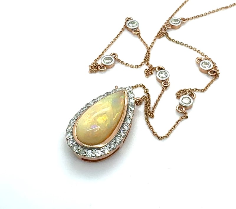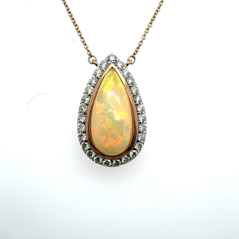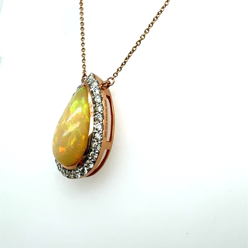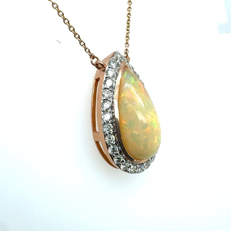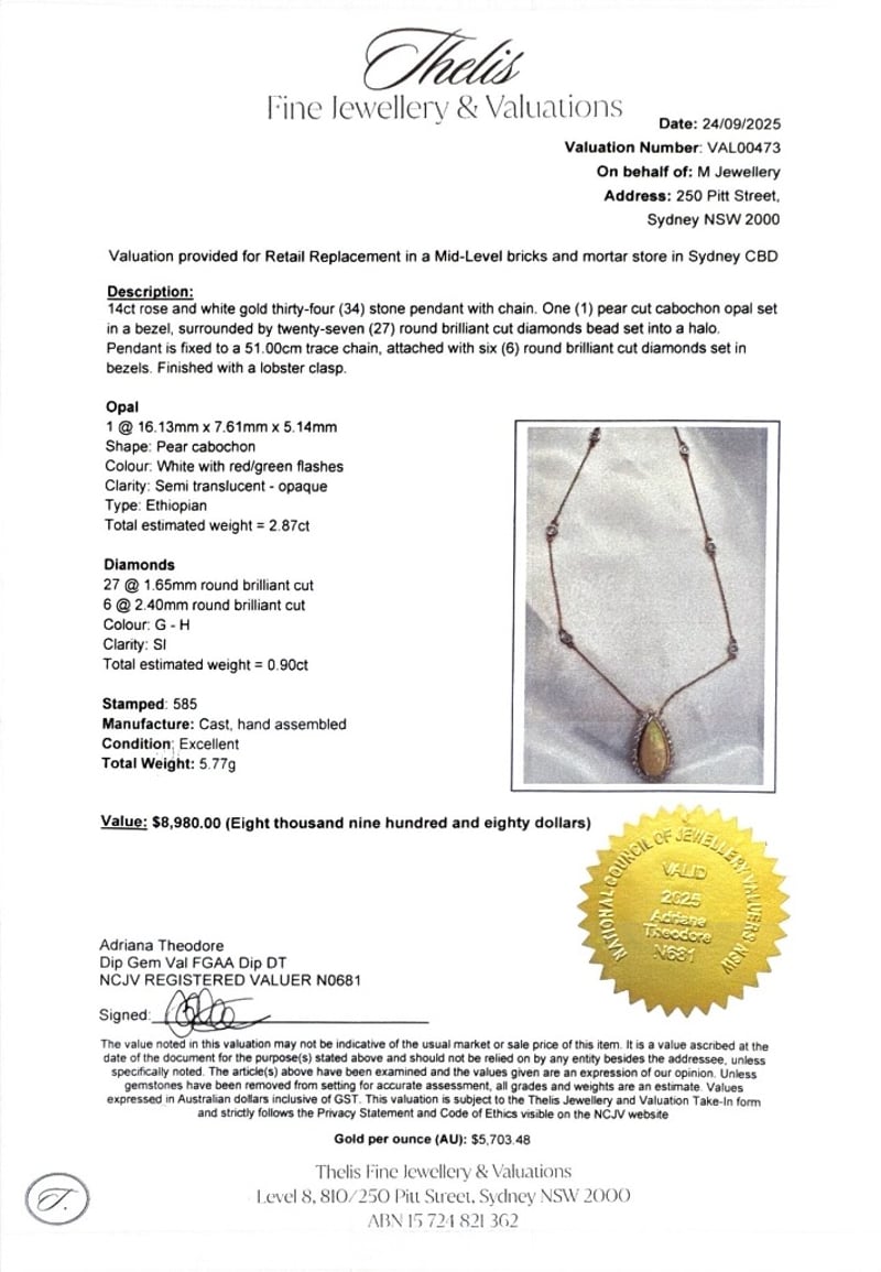 14CT ROSE AND WHITE GOLD PEAR CUT ETHIOPIAN OPAL AND DIAMOND NECKLACEO = 2.87CtD = 0.90CtVal #00473Condition: Good - Refer To ImagesThis valuation has been conducted by an independent third-party professional. The valuation amount is an assessment by the issuing valuer and does not reflect the auction value of the item.Any inquiries regarding the valuation should be directed to the issuing valuer (refer to contact details on the certificate), as Lloyds Auctions has no affiliation or influence over the valuation, the valuer, or the stated amount.Insurance Replacement Valuation Amount: $8,980.00488487+29