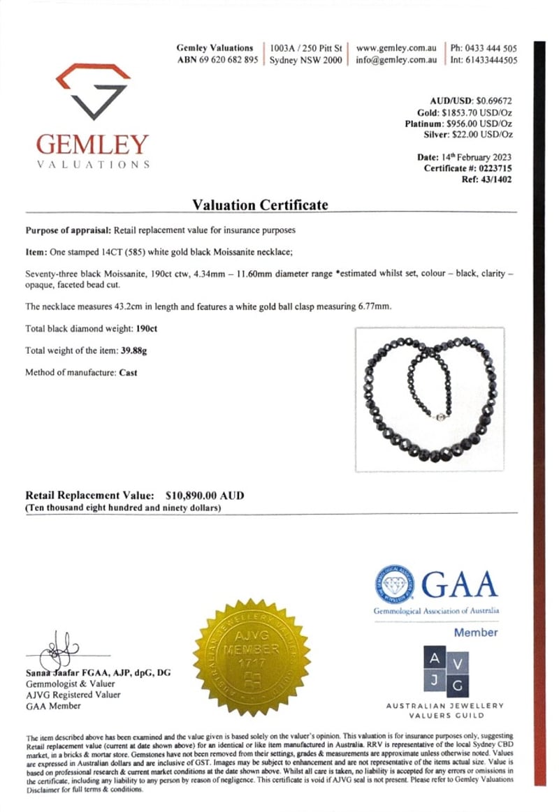 14CT WHITE GOLD BLACK MOISSANITE NECKLACEM = 190CtVal #0223715Condition: Good - Refer To ImagesThis valuation has been conducted by an independent third-party professional. The valuation amount is an assessment by the issuing valuer and does not reflect the auction value of the item.Any inquiries regarding the valuation should be directed to the issuing valuer (refer to contact details on the certificate), as Lloyds Auctions has no affiliation or influence over the valuation, the valuer, or the stated amount.Insurance Replacement Valuation Amount: $10,890.00488487+34