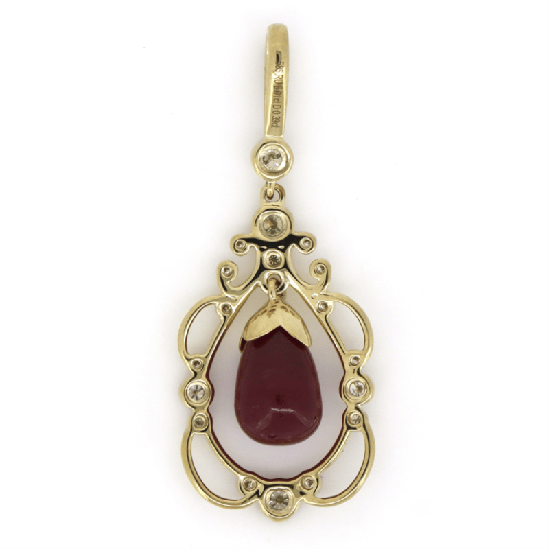 14K YELLOW GOLD, RUBY AND DIAMOND, ORNATE DROP PENDANT.