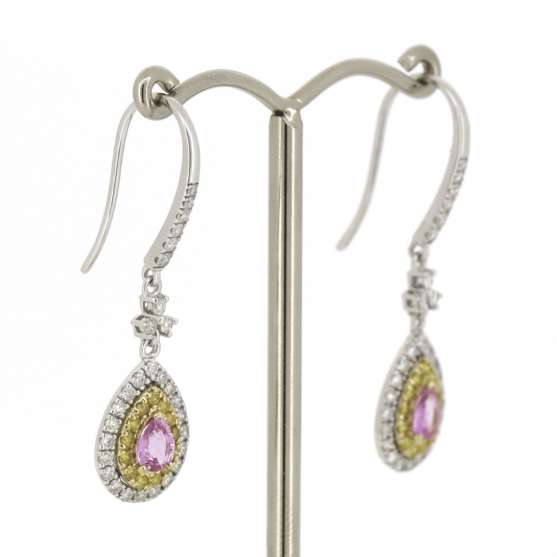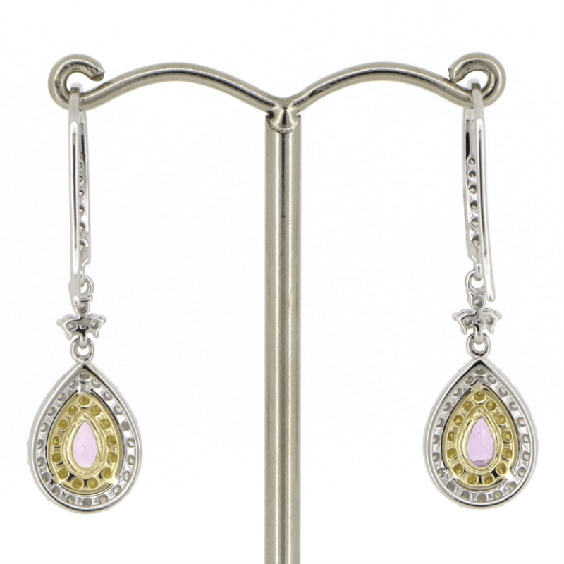 14K WHITE/YELLOW GOLD, PINK SAPPHIRE, FANCY YELLOW DIAMOND AND DIAMOND, HALO DROP EARRINGS. The Design Features, 2 Pear Cut, Strong Pink, Sapphires (0.58Ct Tsw, Very Lightly Included), Claw Set. Surrounding The Centres In The Inner Halos Are, 26 Round Brilliant Cut, Fancy Vivid Treated Yellow, Diamonds (0.27Ct Tdw, Si Clarity), Micro/Bead Set. Decorating The Outer Halos And Hooks Are, 58 Round Brilliant Cut, Diamonds (0.60Ct Tdw, G-J Colour, Si-I2+ Clarity), Micro/Bead Set. Earrings Have Shepherd Hooks. Valuations Provided by an Independent Third-Party Professional Not Directly Associated With Lloyds Auctions at AUD $$17,100.00This valuation has been conducted by an independent third-party professional. The valuation amount is an assessment by the issuing valuer and does not reflect the auction value of the item. Any inquiries regarding the valuation should be directed to the issuing valuer (refer to contact details on the certificate), as Lloyds Auctions has no affiliation or influence over the valuation, the valuer, or the stated amount. Condition: Good - Refer Images 0645921+107