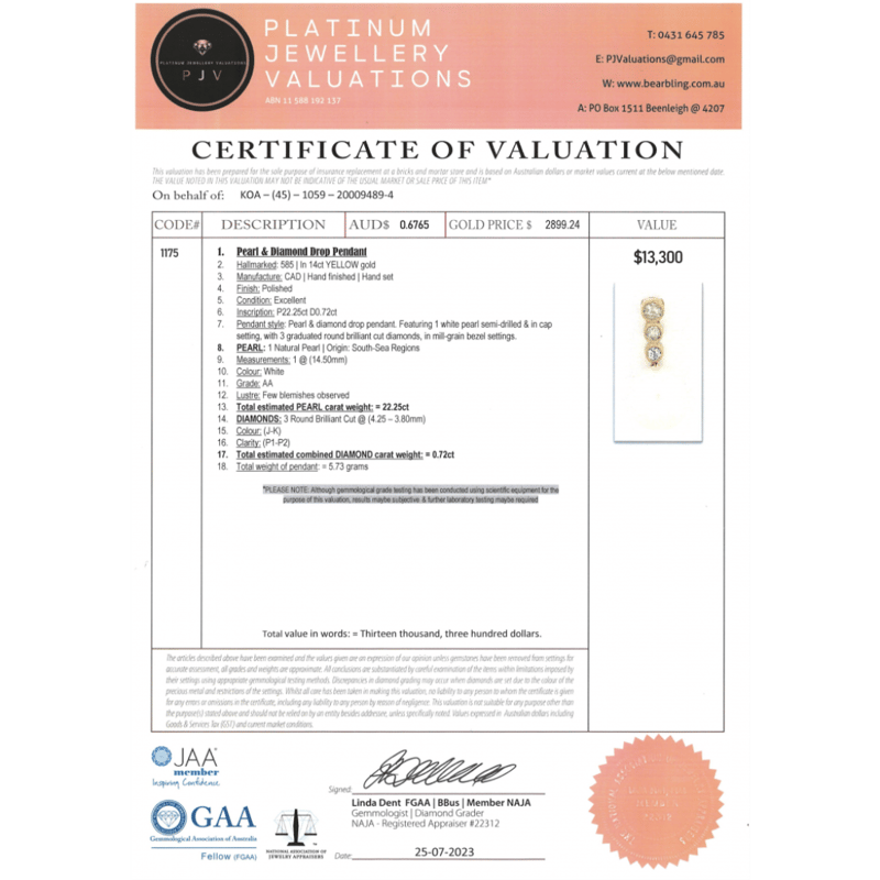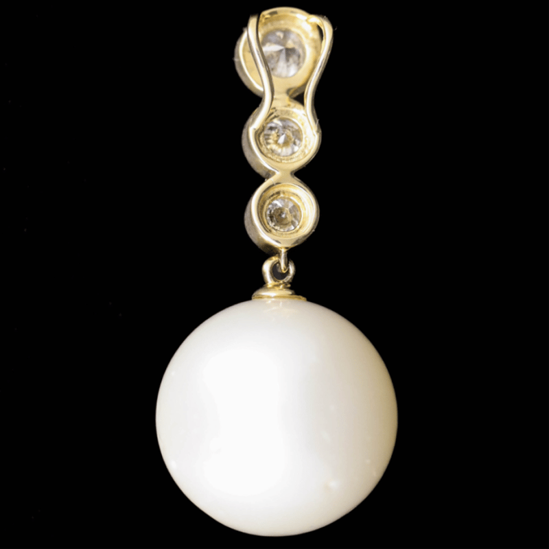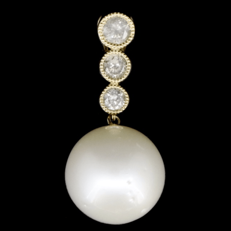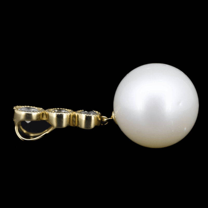 The Design Features, One Near Round, White, Cultured South Sea Pearl (14.50Mm Size, Few Blemishes), Cap Set. Surmounting The Design Are, 3 Round Brilliant Cut, Diamonds (0.72Ct Tdw, J-K Colour, P1-P2 Clarity), Bezel Set With Millegrain Detail.