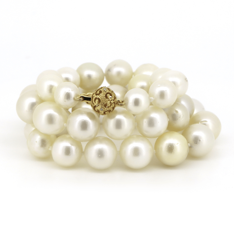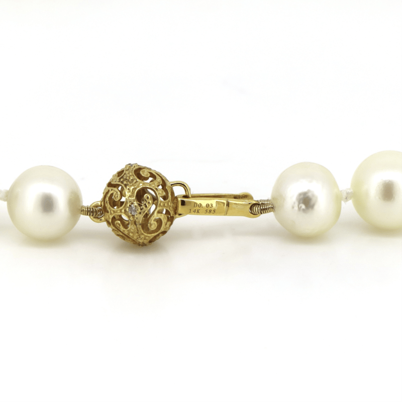 14K YELLOW GOLD, WHITE CULTURED SOUTH SEA PEARL AND DIAMOND, STRAND NECKLACE. The Design Features, 37 Near Round, White With Silver And Gold Overtones, Cultured South Sea Pearls (9.0Mm-13.0Mm Size, Medium Lustre, Natural Growth Blemishes). Embellishing The 14K Yellow Gold Filigree Ball Clasp Are, 4 Round Brilliant Cut, Diamonds (0.03Ct Tdw, H-J Colour, Si-I2 Clarity), Bead Set. Necklace Length Is 45.5Cm. Valuations Provided by an Independent Third-Party Professional Not Directly Associated With Lloyds Auctions at AUD $$12,500.00This valuation has been conducted by an independent third-party professional. The valuation amount is an assessment by the issuing valuer and does not reflect the auction value of the item. Any inquiries regarding the valuation should be directed to the issuing valuer (refer to contact details on the certificate), as Lloyds Auctions has no affiliation or influence over the valuation, the valuer, or the stated amount. Condition: Good - Refer Images 0645921+111