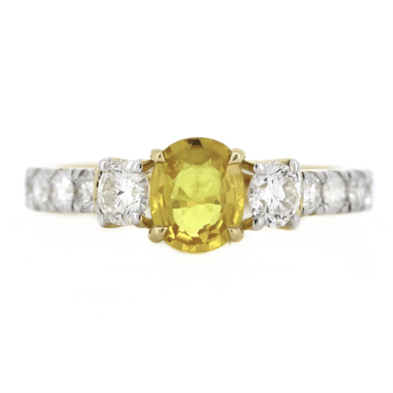 The Centre Features, One Oval Mixed Cut, Deep Strong Orange-Yellow, Ceylon Sapphire (0.96Ct, Moderately Included), 4 Claw Set. Decorating The Shoulders Are, 2 Round Brilliant Cut, Diamonds (0.42Ct Tdw, G-H Colour, Si1-Si2), 4 Claw Set. Embellishing The Band Are, 10 Round Brilliant Cut, Diamonds (0.49Ct Tdw, G-H Colour, Si1-Si2 Clarity), Claw Set. Ring Size M 1/2.