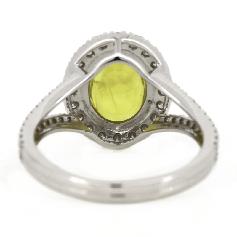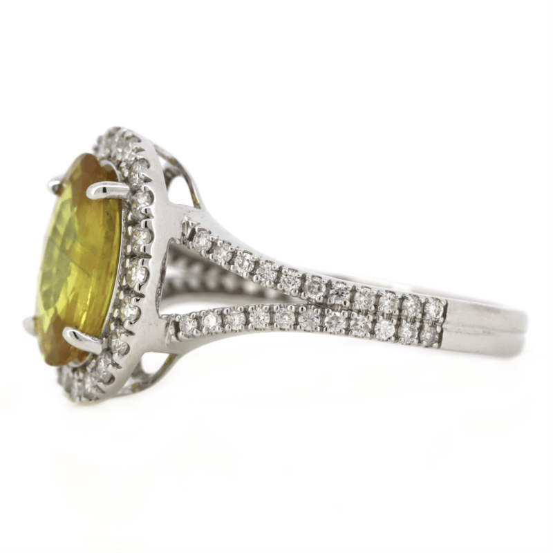 14K WHITE GOLD, YELLOW SAPPHIRE AND DIAMOND, HALO RING. The Centre Features, One Oval Mixed Cut, Medium-Dark Yellow, Sapphire (2.51Ct, Moderate-Heavy Inclusions), 4 Claw Set. Surrounding The Centre In A Halo And Decorating The Split Band Are, 64 Round Brilliant Cut, Diamonds (0.48Ct Tdw, H-J Colour, Si-I2 Clarity), Bead Set. Ring Size M 1/2. Valuations Provided by an Independent Third-Party Professional Not Directly Associated With Lloyds Auctions at AUD $$14,300.00This valuation has been conducted by an independent third-party professional. The valuation amount is an assessment by the issuing valuer and does not reflect the auction value of the item. Any inquiries regarding the valuation should be directed to the issuing valuer (refer to contact details on the certificate), as Lloyds Auctions has no affiliation or influence over the valuation, the valuer, or the stated amount. Condition: Good - Refer Images 0645921+115