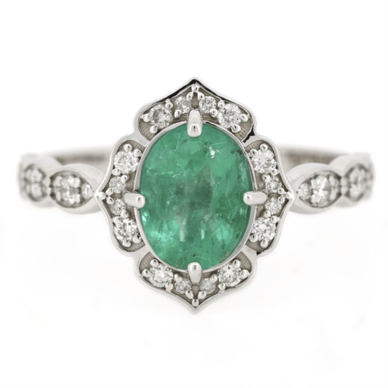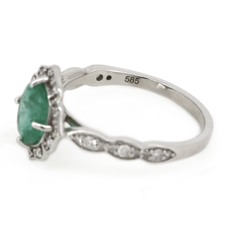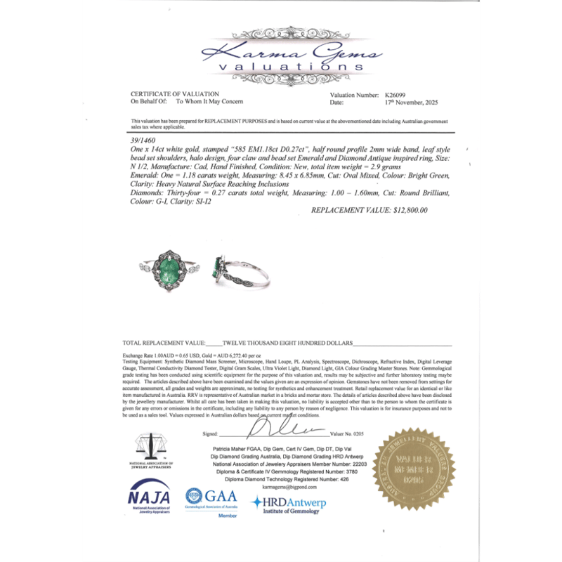 14K WHITE GOLD, EMERALD AND DIAMOND, HALO DRESS RING. The Centre Features, One Oval Cut, Bright Green, Emerald (1.18Ct, Heavy Natural Surface Reaching Inclusions), 4 Claw Set. Embellishing The Design Are, 34 Round Brilliant Cut, Diamonds (0.27Ct Tdw, G-I Colour, Si-I2 Clarity), Bead Set. Ring Size N 1/2. Valuations Provided by an Independent Third-Party Professional Not Directly Associated With Lloyds Auctions at AUD $$12,800.00This valuation has been conducted by an independent third-party professional. The valuation amount is an assessment by the issuing valuer and does not reflect the auction value of the item. Any inquiries regarding the valuation should be directed to the issuing valuer (refer to contact details on the certificate), as Lloyds Auctions has no affiliation or influence over the valuation, the valuer, or the stated amount. Condition: Good - Refer Images 0645921+118