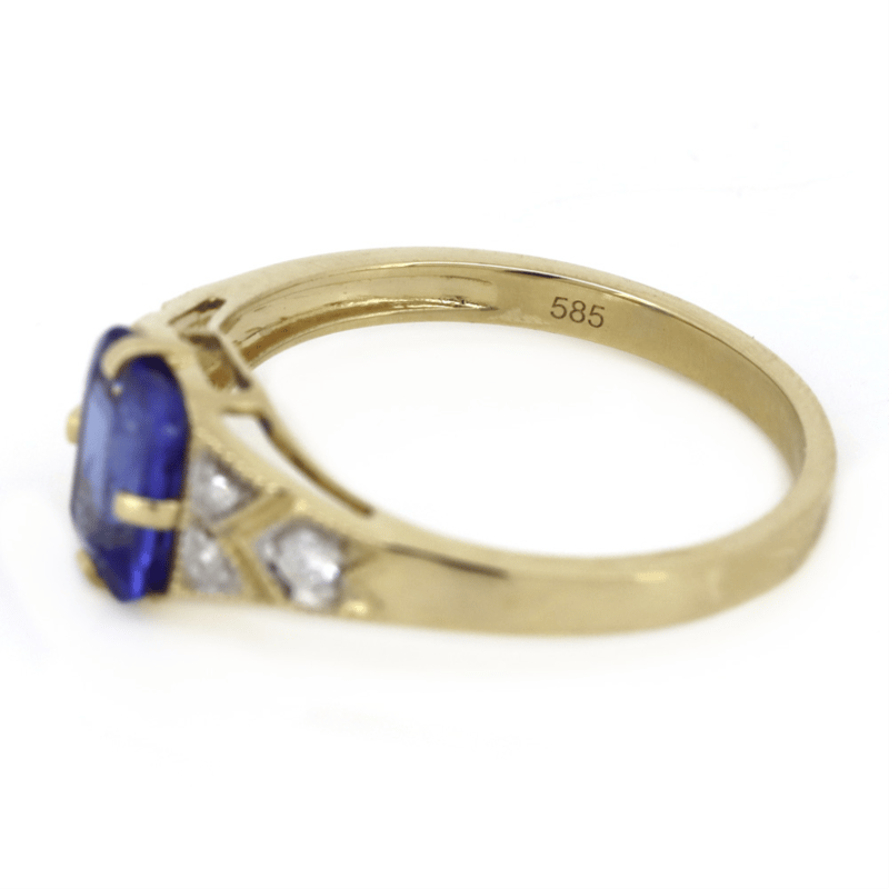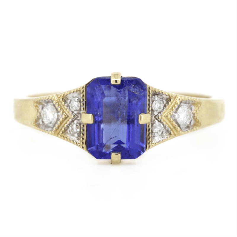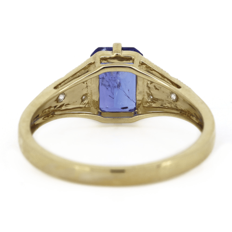 14K YELLOW GOLD, TANZANITE AND DIAMOND, DRESS RING. The Centre Features, One Emerald Cut, Strong Violet Blue, Tanzanite (1.45Ct, Heavy Inclusions), 4 Claw Set. Decorating The Band Are, 6 Round Brilliant Cut, Diamonds (0.10Ct Tdw, H-I Colour, Si-I1 Clarity), Micro-Pip Claw Set With Millegrain Detail. Ring Size P 1/2. Valuations Provided by an Independent Third-Party Professional Not Directly Associated With Lloyds Auctions at AUD $$10,600.00This valuation has been conducted by an independent third-party professional. The valuation amount is an assessment by the issuing valuer and does not reflect the auction value of the item. Any inquiries regarding the valuation should be directed to the issuing valuer (refer to contact details on the certificate), as Lloyds Auctions has no affiliation or influence over the valuation, the valuer, or the stated amount. Condition: Good - Refer Images 0645921+120