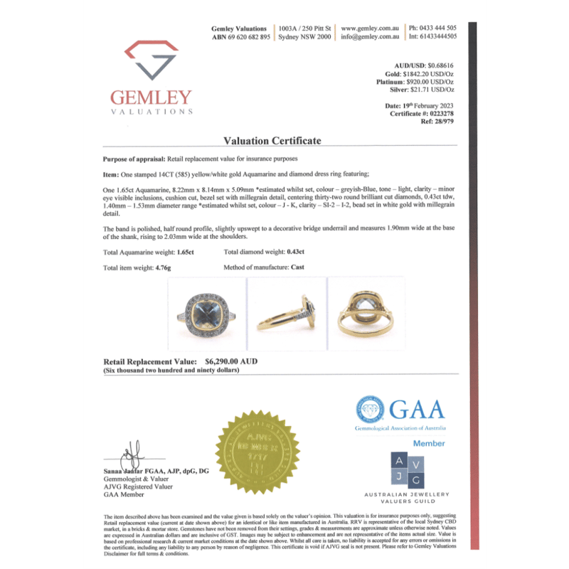 The Centre Features, One Cushion Cut, Light Greyish-Blue, Aquamarine (1.65Ct, Eye Visible Inclusions), 4 Claw Set. Surrounding The Centre In A Halo Are, 32 Round Brilliant Cut, Diamonds (0.43Ct Tdw, J-K Colour, Si2-I2 Clarity), Claw Set. Ring Size M.