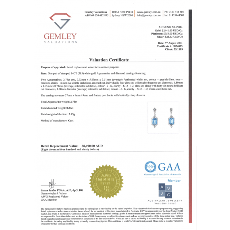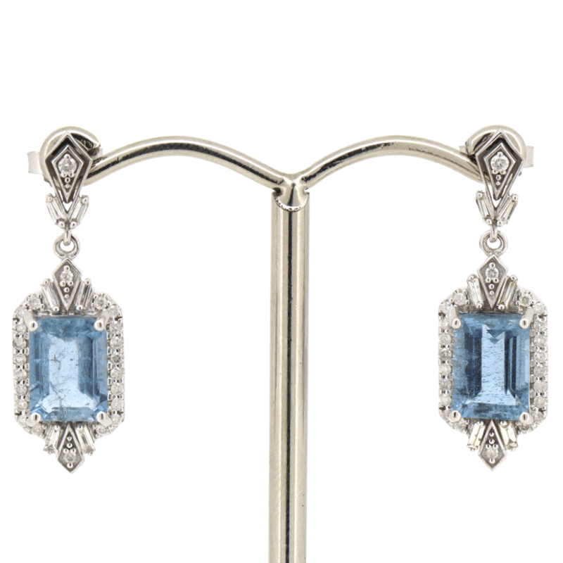The Centre Features, 2 Emerald Cut, Medium Greyish-Blue, Aquamarines (2.73Ct Tsw, Minor Eye Inclusions), 4 Claw Set. Decorating The Centres Are, 12 Baguette And 46 Round Brilliant Cut, Diamonds (0.37Ct Tdw, J-K Colour, Si2-I2 Clarity), Micro-Claw/Bead Set. The Earrings Have Post Backs With 14K White Gold Butterfly Clasps.