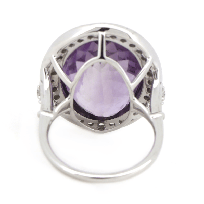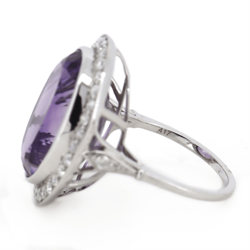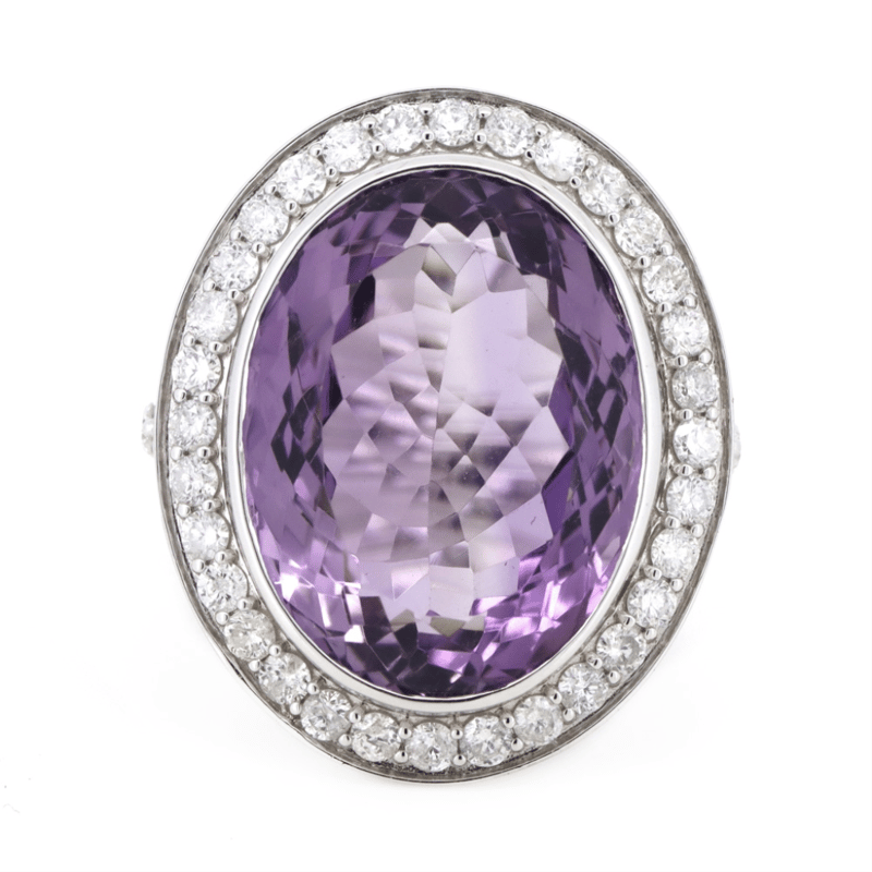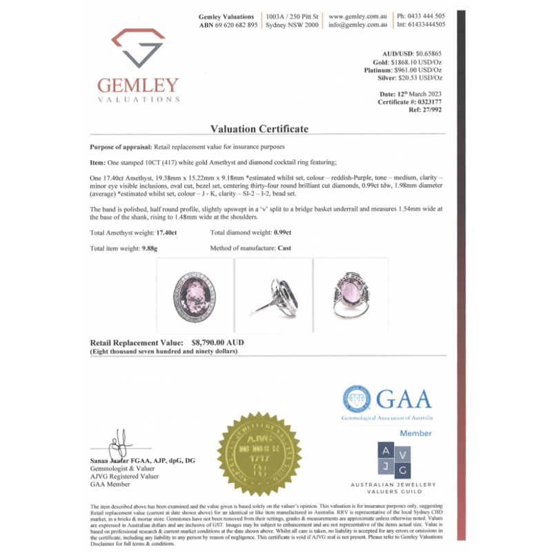10K WHITE GOLD, 17.40CT AMETHYST AND DIAMOND, STATEMENT RING. The Centre Features, One Oval Cut, Medium Reddish-Purple, Amethyst (17.40Ct, Minor Eye Visible Inclusions), Bezel Set. Surrounding The Centre In A Halo And Decorating The Shoulders Are, 34 Round Brilliant Cut, Diamonds (0.99Ct Tdw, J-K Colour, Si2-I2 Clarity), Bead Set. Ring Size P. Valuations Provided by an Independent Third-Party Professional Not Directly Associated With Lloyds Auctions at AUD $$8,790.00This valuation has been conducted by an independent third-party professional. The valuation amount is an assessment by the issuing valuer and does not reflect the auction value of the item. Any inquiries regarding the valuation should be directed to the issuing valuer (refer to contact details on the certificate), as Lloyds Auctions has no affiliation or influence over the valuation, the valuer, or the stated amount. Condition: Good - Refer Images 0645921+130