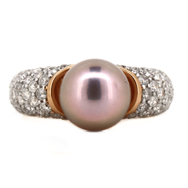 14K ROSE GOLD, PURPLE CULTURED SOUTH SEA PEARL AND DIAMOND, STATEMENT RING.