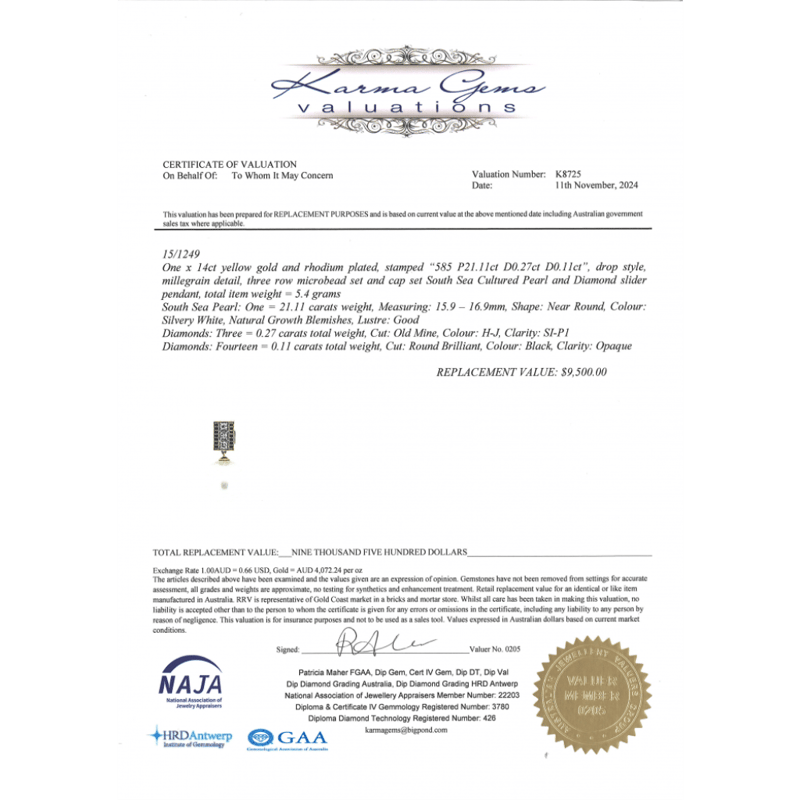 14K YELLOW GOLD, WHITE CULTURED SOUTH SEA PEARL AND DIAMOND, PENDANT.