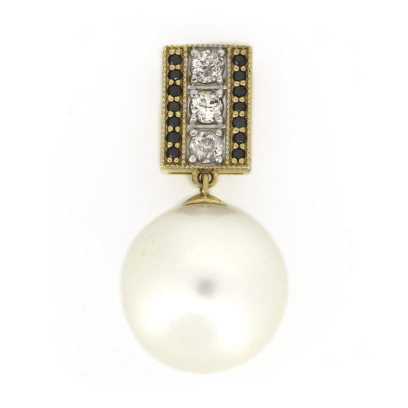The Design Features, One Near Round, White With Silver Overtones, Cultured South Sea Pearl (21.11Ct/15.90-16.90Mm Sizes, Good Lustre, Natural Blemishes). Decorating The Bail Are 3 Round Brilliant Cut, Diamonds (0.27Ct Tdw, Colour, Clarity), And 14 Black Diamonds (0.11Ct Tdw, H-J Colour, Si-P1 Clarity) Claw Set.