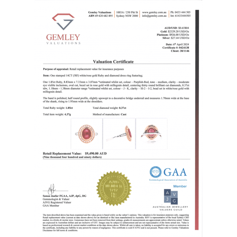 The Centre Features, One Oval Cut, Purplish-Red, Ruby (1.85Ct, Moderate Eye Visible Inclusions), Bezel Set In Rose Gold. Surrounding The Centre Are, 30 Round Brilliant Cut, Diamonds (0.37Ct Tdw, J-K Colour, Si2-I2 Clarity), Bead Set With Millegrain Detail. Ring Size O.