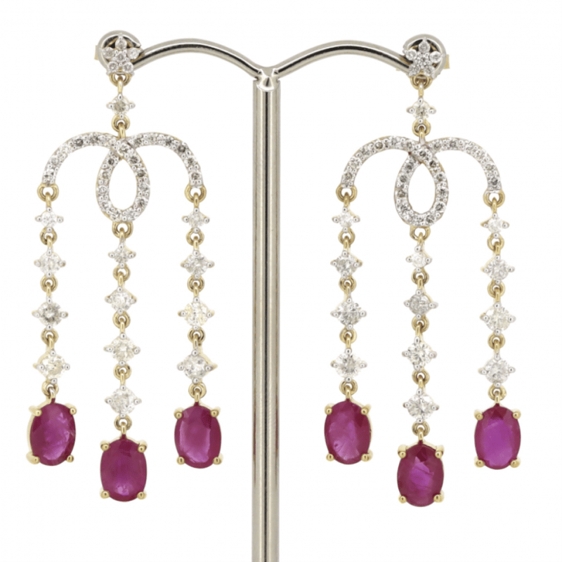 The Design Features, 6 Oval Cut, Medium Purplish-Red, Rubies (4.57Ct Tsw, Included), Claw Set. Decorating The Design Are, 84 Round Brilliant Cut, Diamonds (2.25Ct Tdw, J-K Colour, Si2-I2 Clarity), Claw/Bead Set In White Gold. The Earrings Have Post Backs, With 14K Yellow Gold Butterfly Clasps.