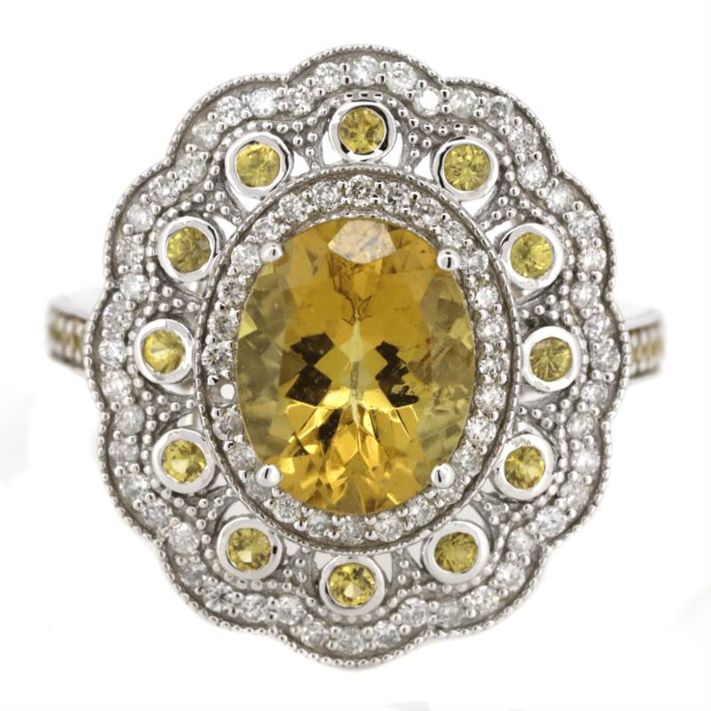 14K WHITE GOLD, YELLOW HELIODOR, 0.44CT TSW YELLOW SAPPHIRE AND DIAMOND, STATEMENT CLUSTER RING The Centre Features, One Oval Mixed Cut, Golden Yellow, Heliodor (2.36Ct, Slightly Included), 4 Claw Set. Accompanied By, 22 Round Brilliant Cut, Gold Yellow, Ceylon Sapphires (0.44Ct Tsw, Moderate Natural Inclusions), Bezel Set. Encompassing The Design Are, 76 Round Brilliant Cut, Diamonds (0.43Ct Tdw, H-K Colour, Si1-Si2 Clarity), Micro-Bead Set With Millegrain Detail. Ring Size N 1/2. Valuations Provided by an Independent Third-Party Professional Not Directly Associated With Lloyds Auctions at AUD $$17,200.00This valuation has been conducted by an independent third-party professional. The valuation amount is an assessment by the issuing valuer and does not reflect the auction value of the item. Any inquiries regarding the valuation should be directed to the issuing valuer (refer to contact details on the certificate), as Lloyds Auctions has no affiliation or influence over the valuation, the valuer, or the stated amount. Condition: Good - Refer Images 0645921+142
