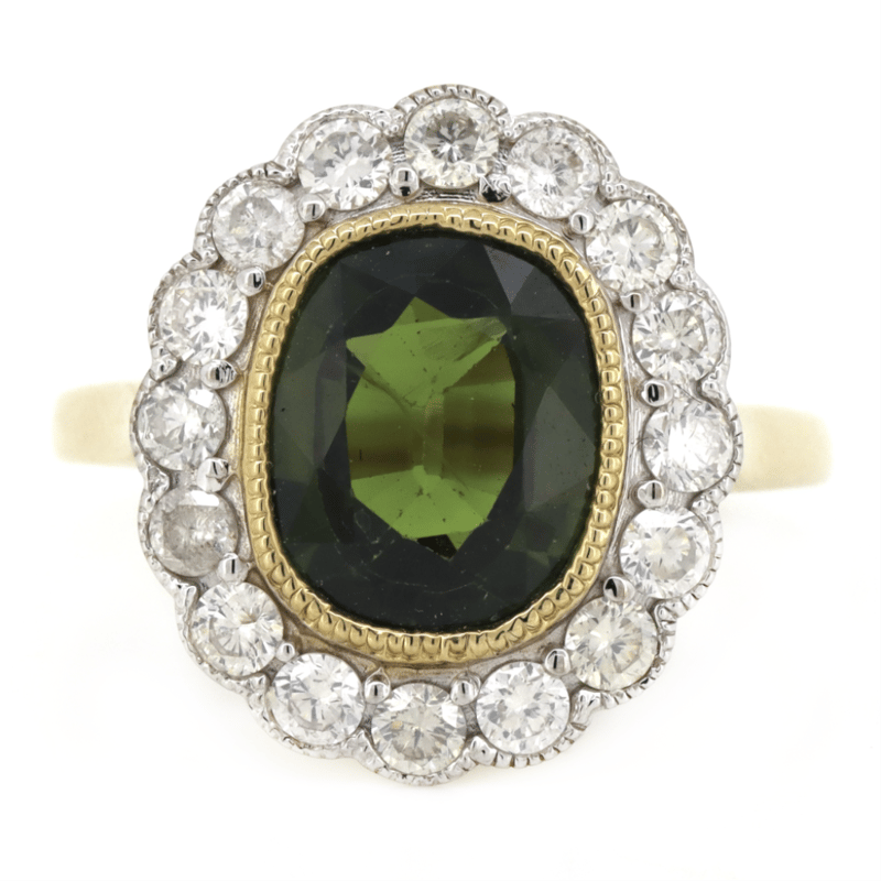 14K YELLOW GOLD, GREEN SAPPHIRE AND DIAMOND, HALO RING. The Centre Features, One Oval Cut, Medium Dark Bluish-Green, Sapphire (3.75Ct, Minor Eye Visible Inclusions), Bezel Set With Millegrain Detail. Surrounding The Centre In A Halo Are, 16 Round Brilliant Cut, Diamonds (0.88Ct Tdw, J-K Colour, Si2-I2 Clarity), Semi-Bezel/Bead Set In White Gold. Ring Size O 1/2. Valuations Provided by an Independent Third-Party Professional Not Directly Associated With Lloyds Auctions at AUD $$12,790.00This valuation has been conducted by an independent third-party professional. The valuation amount is an assessment by the issuing valuer and does not reflect the auction value of the item. Any inquiries regarding the valuation should be directed to the issuing valuer (refer to contact details on the certificate), as Lloyds Auctions has no affiliation or influence over the valuation, the valuer, or the stated amount. Condition: Good - Refer Images 0645921+144