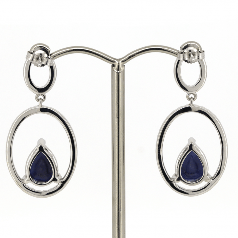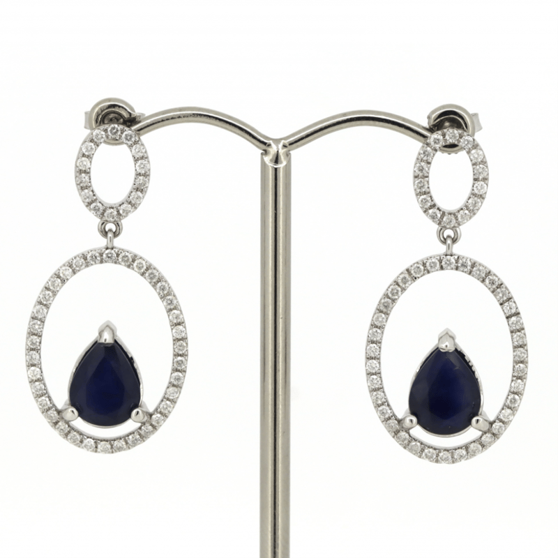 The Design Features, 2 Pear Cut, Medium Dark Royal Blue, Sapphires (4.15Ct Tsw, Eye Visible Inclusions), 3 Claw Set. Decorating The Centres In Double Oval Hoops Are, 96 Round Brilliant Cut, Diamonds (0.84Ct Tdw, J-K Colour, Si2-I2 Clarity), Claw Set. The Earrings Have Post Backs, With 14K White Gold Butterfly Clasps.