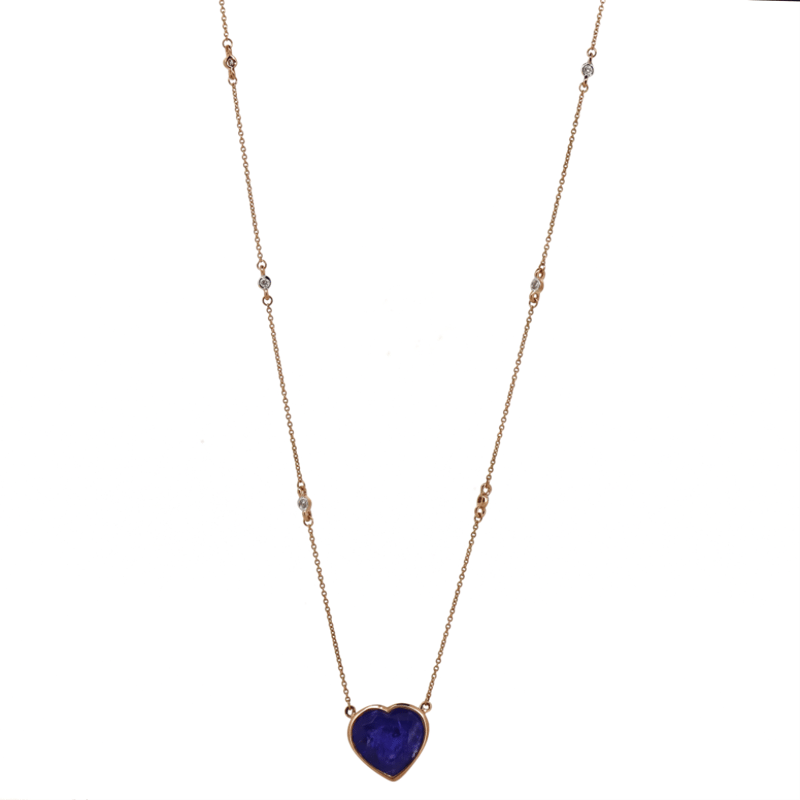 14K ROSE GOLD, TANZANITE AND DIAMOND, NECKLACE. The Necklace Features, One Heart Cut, Deep Purple Violet, Tanzanite (7.75Ct, Moderately-Heavily Included), Bezel Set. Decorating The Chain Are, 8 Round Brilliant Cut, Diamonds (0.12Ct Tdw, G-H Colour, Si1-Si2 Clarity), Bezel Set. The Necklace Has A Lobster Claw Clasp. Chain Length Is 51Cm. Valuations Provided by an Independent Third-Party Professional Not Directly Associated With Lloyds Auctions at AUD $$12,000.00This valuation has been conducted by an independent third-party professional. The valuation amount is an assessment by the issuing valuer and does not reflect the auction value of the item. Any inquiries regarding the valuation should be directed to the issuing valuer (refer to contact details on the certificate), as Lloyds Auctions has no affiliation or influence over the valuation, the valuer, or the stated amount. Condition: Good - Refer Images 0645921+147
