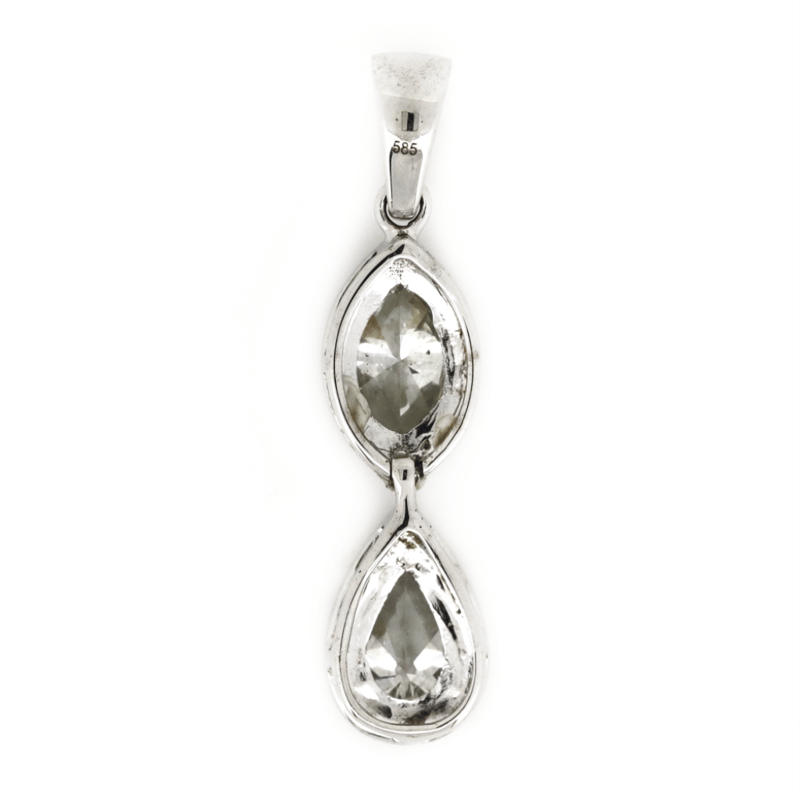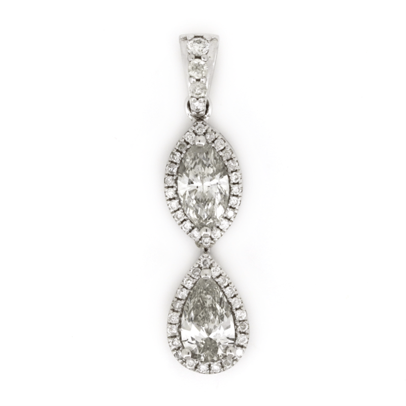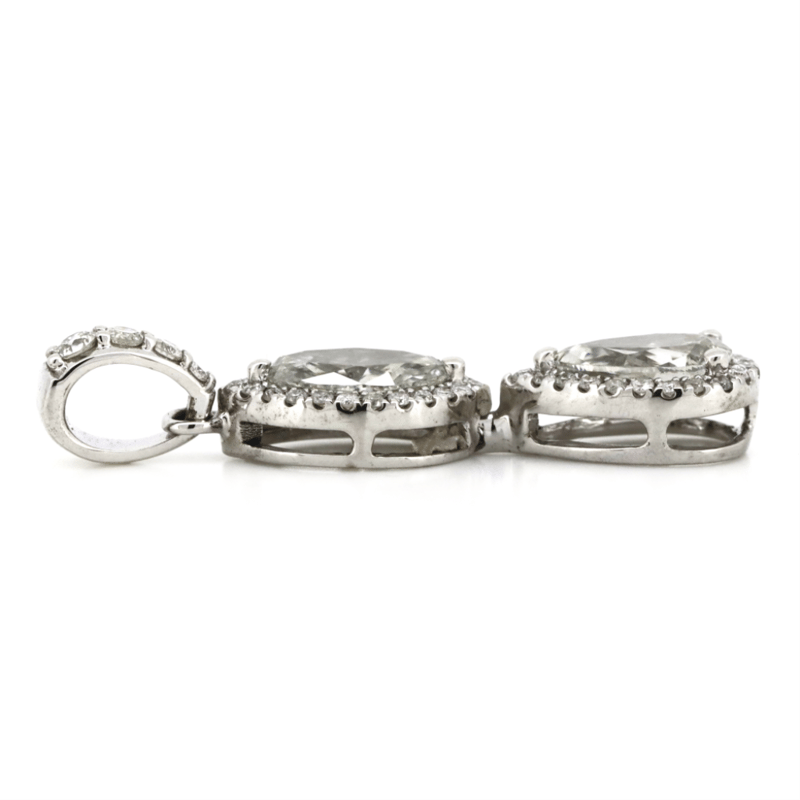 14K WHITE GOLD AND DIAMOND, DOUBLE DROP HALO PENDANT. The Pendant Features, One Pear Cut And One Marquise Cut, Diamonds (0.81Ct Tdw, L-M/J-K Colour, P2+ Clarity), Claw Set. Surrounding The Centres In Halos And Decorating The Band Are, 48 Round Brilliant Cut, Diamonds (0.24Ct Tdw, G-K Colour, Si1-Si2 Clarity), Bead Set. Valuations Provided by an Independent Third-Party Professional Not Directly Associated With Lloyds Auctions at AUD $$12,600.00This valuation has been conducted by an independent third-party professional. The valuation amount is an assessment by the issuing valuer and does not reflect the auction value of the item. Any inquiries regarding the valuation should be directed to the issuing valuer (refer to contact details on the certificate), as Lloyds Auctions has no affiliation or influence over the valuation, the valuer, or the stated amount. Condition: Good - Refer Images 0645921+149