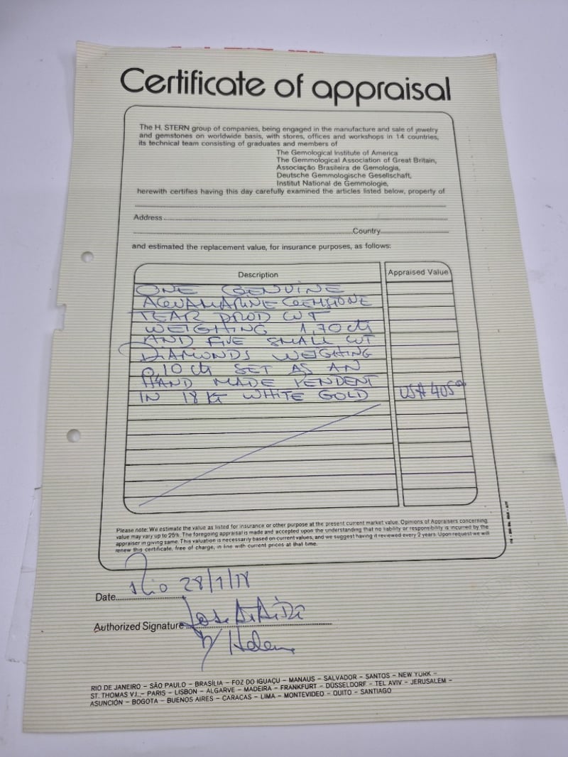 Featuring 1.7Ct Tear Drop Cut Aquamarine, And 5 Small Cut Diamonds