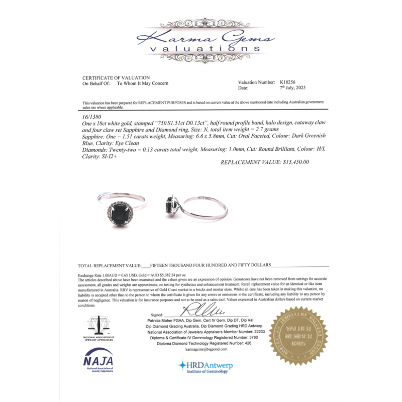 18K WHITE GOLD, BLUE/GREEN SAPPHIRE AND DIAMOND, HALO RING. The Centre Features, One Dark Greenish-Blue, Sapphire (1.51Ct, Eye Clean Clarity), 4 Claw Set. Surrounding The Centre In A Halo Are, 22 Round Brilliant Cut, Diamonds (0.13Ct Tdw, H-I Colour, Si-I2+ Clarity), Cutaway Claw Set. Ring Size N. Valuations Provided by an Independent Third-Party Professional Not Directly Associated With Lloyds Auctions at AUD $$15,450.00This valuation has been conducted by an independent third-party professional. The valuation amount is an assessment by the issuing valuer and does not reflect the auction value of the item. Any inquiries regarding the valuation should be directed to the issuing valuer (refer to contact details on the certificate), as Lloyds Auctions has no affiliation or influence over the valuation, the valuer, or the stated amount. Condition: Good - Refer Images 0+216