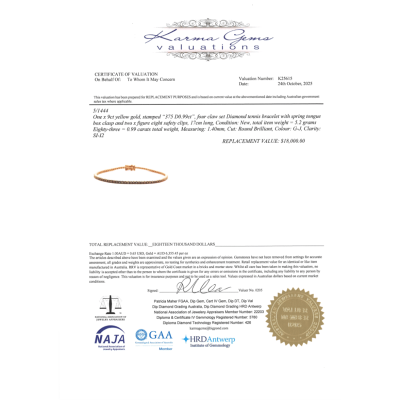9K YELLOW GOLD, 0.99CT TDW DIAMOND, TENNIS BRACELET. The Design Features, 83 Round Brilliant Cut, Diamonds (0.99Ct Tdw, G-J Colour, Si-I2 Clarity), 4-Claw Set. The Bracelet Has A Box Clasp With Double Figure 8 Clasps. Bracelet Length Is 17Cm. Valuations Provided by an Independent Third-Party Professional Not Directly Associated With Lloyds Auctions at AUD $$18,000.00This valuation has been conducted by an independent third-party professional. The valuation amount is an assessment by the issuing valuer and does not reflect the auction value of the item. Any inquiries regarding the valuation should be directed to the issuing valuer (refer to contact details on the certificate), as Lloyds Auctions has no affiliation or influence over the valuation, the valuer, or the stated amount. Condition: Good - Refer Images 0+223