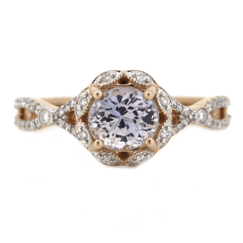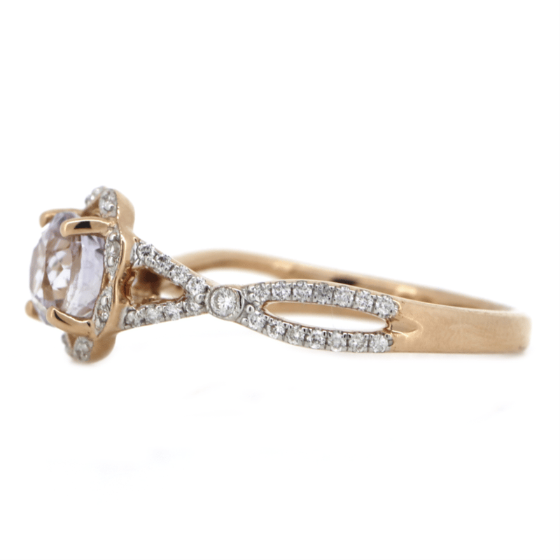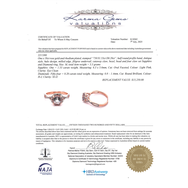 The Centre Features, One Oval Faceted Cut, Light Pink, Sapphire (1.53Ct, Eye Clean Clarity), 4 Claw Set. Encompassing The Centre And Decorating The Shoulders Are, 54 Round Brilliant Cut, Diamonds (0.20Ct Tdw, H-J Colour, Si-12 Clarity), Bezel/Bead Set. Ring Size M.