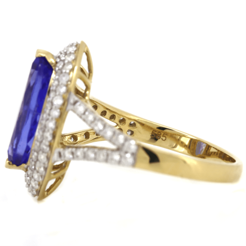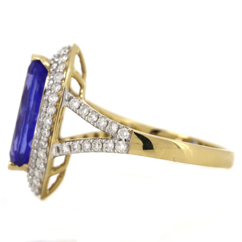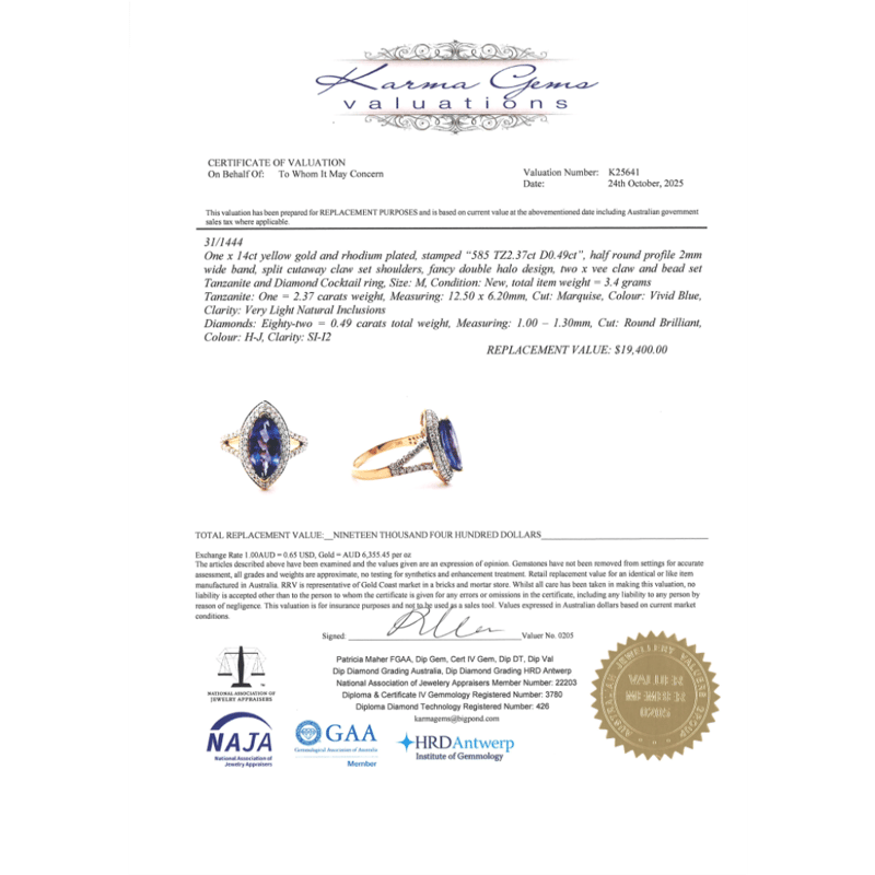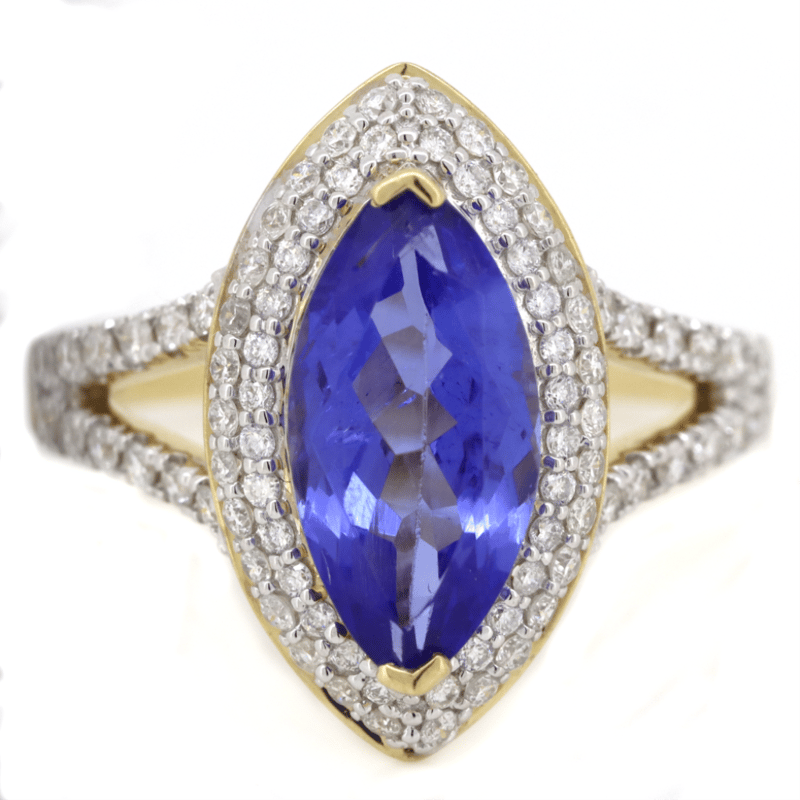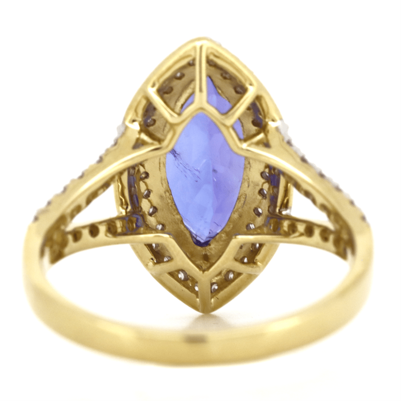 14K YELLOW GOLD, TANZANITE AND DIAMOND, DOUBLE HALO SPLIT BAND RING. The Centre Features, One Marquise Cut, Tanzanite (2.37Ct, Very Light Natural Inclusions), 2 Claw Set. Surrounding The Centre In A Double Halo And Decorating The Split Band Are, 82 Round Brilliant Cut, Diamonds (0.49Ct Tdw, H-J Colour, Si-I2 Clarity), Micro-Bead/Pip-Claw Set. Ring Size M. Valuations Provided by an Independent Third-Party Professional Not Directly Associated With Lloyds Auctions at AUD $$19,400.00This valuation has been conducted by an independent third-party professional. The valuation amount is an assessment by the issuing valuer and does not reflect the auction value of the item. Any inquiries regarding the valuation should be directed to the issuing valuer (refer to contact details on the certificate), as Lloyds Auctions has no affiliation or influence over the valuation, the valuer, or the stated amount. Condition: Good - Refer Images 0+241