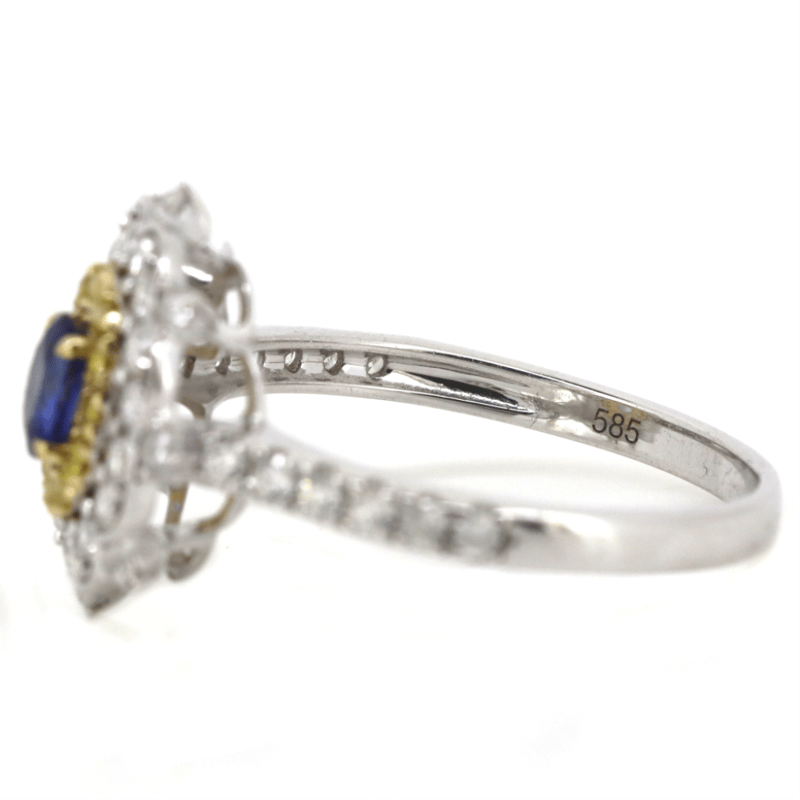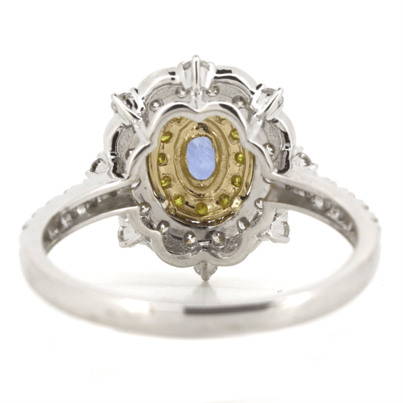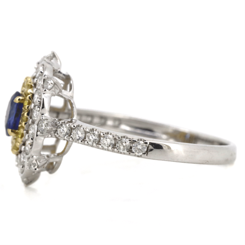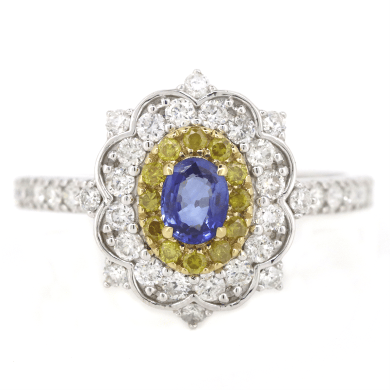 14K WHITE/YELLOW GOLD, 0.32CT CEYLON SAPPHIRE, FANCY YELLOW DIAMOND AND DIAMOND, RING. The Centre Features, One Oval Mixed Cut, Ceylon Sapphire (0.32Ct, Very Light Natural Inclusions), Claw Set. Surrounding The Centre In The Inner Halo Are, 12 Round Brilliant Cut, Fancy Yellow Diamonds (0.13Ct Tdw, Si-I1 Clarity), Claw Set. Surrounding The Centre In The Outer Halo And Decorating The Band Are, 35 Round Brilliant Cut, Diamonds (0.57Ct Tdw, G-J Colour, Si-I2 Clarity), Claw Set. Ring Size N. Valuations Provided by an Independent Third-Party Professional Not Directly Associated With Lloyds Auctions at AUD $$13,600.00This valuation has been conducted by an independent third-party professional. The valuation amount is an assessment by the issuing valuer and does not reflect the auction value of the item. Any inquiries regarding the valuation should be directed to the issuing valuer (refer to contact details on the certificate), as Lloyds Auctions has no affiliation or influence over the valuation, the valuer, or the stated amount. Condition: Good - Refer Images 0+249