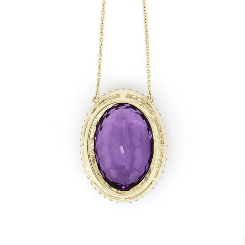 14K YELLOW GOLD, 16.27CT AMETHYST AND DIAMOND, STATEMENT NECKLACE. The Pendant Features, One Oval Faceted Cut, Medium Deep Purple, Amethyst (16.27Ct, Eye Clean), Bezel Set. Surrounding The Centre In A Halo Are, 48 Round Brilliant Cut, Diamonds (0.41Ct, I-K Colour, P1-P2 Clarity), Claw Set. The Fine Wire Cable Also Features, 6 Round Brilliant Cut, Diamonds (0.13Ct, I-K Colour, Si2-P2 Clarity), Bezel Set. The Necklace Features A Lobster Clasp. Necklace Length Is 53.5Cm. Valuations Provided by an Independent Third-Party Professional Not Directly Associated With Lloyds Auctions at AUD $$13,700.00 This valuation has been conducted by an independent third-party professional. The valuation amount is an assessment by the issuing valuer and does not reflect the auction value of the item. Any inquiries regarding the valuation should be directed to the issuing valuer (refer to contact details on the certificate), as Lloyds Auctions has no affiliation or influence over the valuation, the valuer, or the stated amount. Condition: Good - Refer Images 0 +308