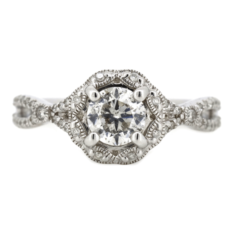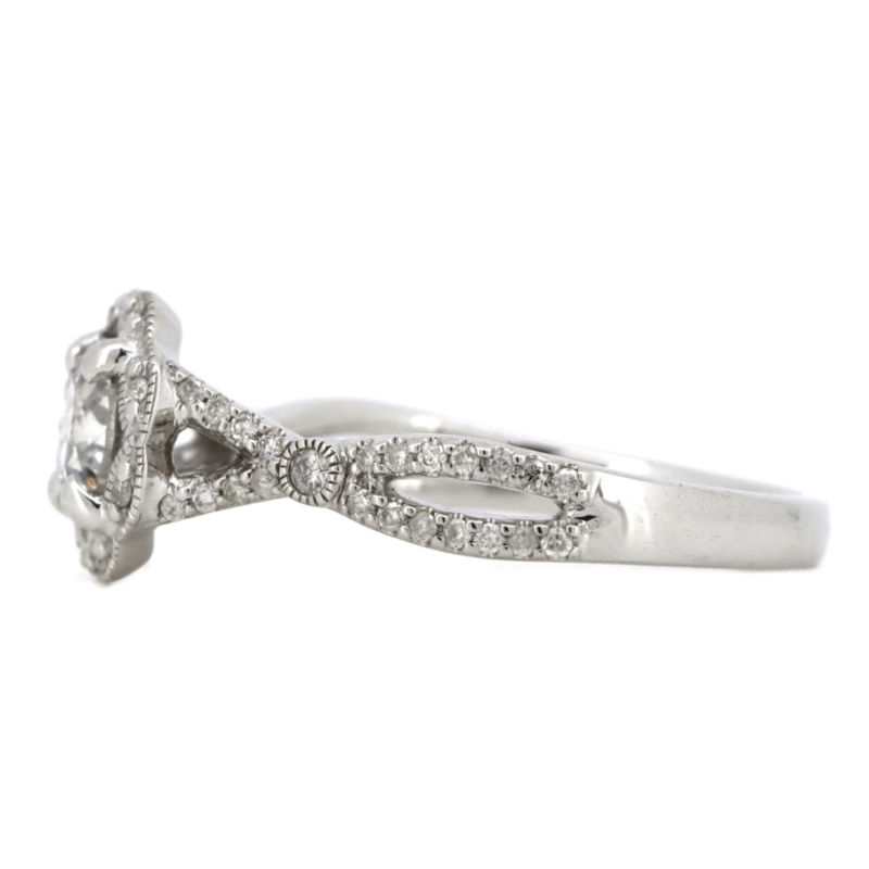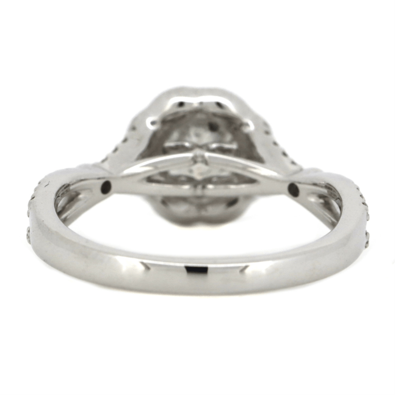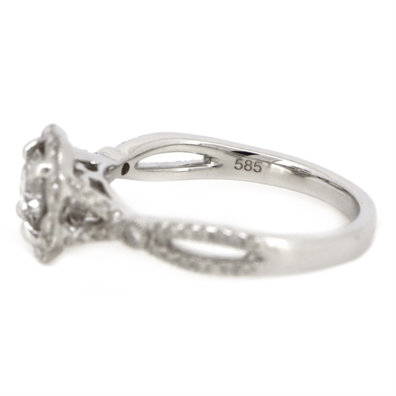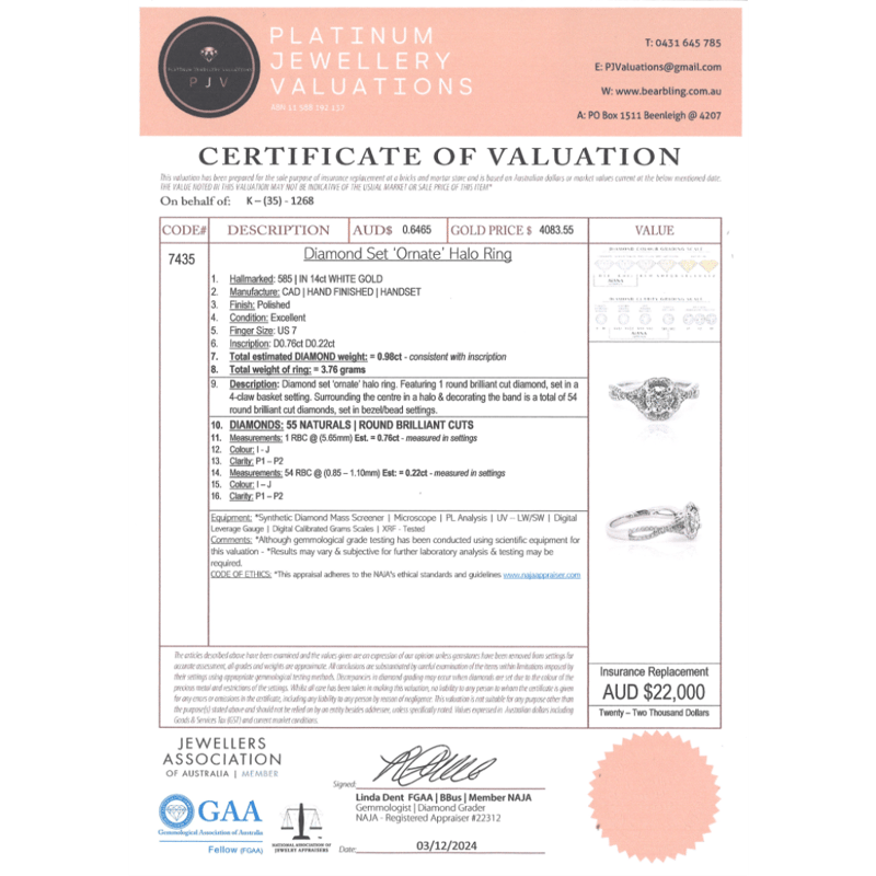 14K WHITE GOLD AND DIAMOND, HALO TWIST BAND RING. The Centre Features, One Round Brilliant Cut, Diamond (0.76Ct, I-J Colour, P1-P2 Clarity), 4 Claw Set. Surrounding The Centre In A Halo And Decorating The Twist Band Are, 54 Round Brilliant Cut, Diamonds (0.22Ct Tdw, I-J Colour, P1-P2 Clarity), Bead/Bezel Set. Ring Size N. Valuations Provided by an Independent Third-Party Professional Not Directly Associated With Lloyds Auctions at AUD $$22,000.00 This valuation has been conducted by an independent third-party professional. The valuation amount is an assessment by the issuing valuer and does not reflect the auction value of the item. Any inquiries regarding the valuation should be directed to the issuing valuer (refer to contact details on the certificate), as Lloyds Auctions has no affiliation or influence over the valuation, the valuer, or the stated amount. Condition: Good - Refer Images 0 +309