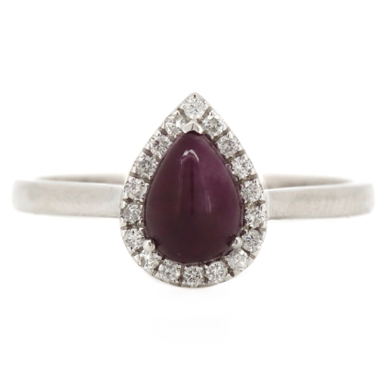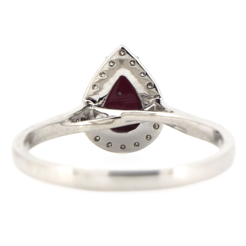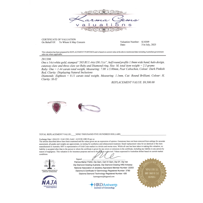 14K WHITE GOLD, RUBY AND DIAMOND, HALO RING. The Centre Features, One Pear Cabochon Cut, Ruby (1.44Ct, Natural Inclusions), Claw Set. Surrounding The Centre In A Halo Are, 18 Round Brilliant Cut, Diamonds (0.11Ct Tdw, H Colour, Si-I2 Clarity), Claw Set. Ring Size M. Valuations Provided by an Independent Third-Party Professional Not Directly Associated With Lloyds Auctions at AUD $$9,500.00 This valuation has been conducted by an independent third-party professional. The valuation amount is an assessment by the issuing valuer and does not reflect the auction value of the item. Any inquiries regarding the valuation should be directed to the issuing valuer (refer to contact details on the certificate), as Lloyds Auctions has no affiliation or influence over the valuation, the valuer, or the stated amount. Condition: Good - Refer Images 0 +312