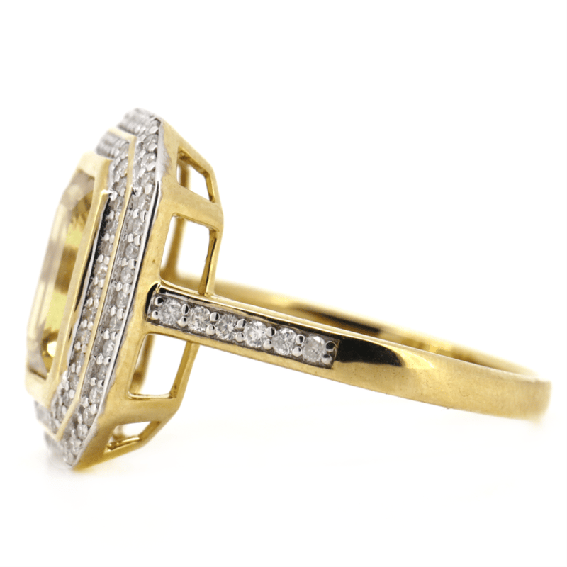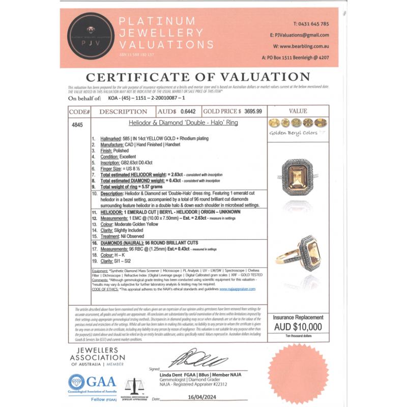 14K YELLOW GOLD, HELIODOR AND DIAMOND, DOUBLE HALO RING. The Centre Features, One Emerald Cut, Heliodor (2.63Ct, Minor Eye Visible Inclusions), Bezel Set. Surrounding The Centre In A Double Halo And Decorating The Band Are, 96 Round Brilliant Cut, Diamonds (0.43Ct Tdw, H-K Colour, Si1-Si2 Clarity), Bead Set. Ring Size P 1/2. Valuations Provided by an Independent Third-Party Professional Not Directly Associated With Lloyds Auctions at AUD $$10,000.00 This valuation has been conducted by an independent third-party professional. The valuation amount is an assessment by the issuing valuer and does not reflect the auction value of the item. Any inquiries regarding the valuation should be directed to the issuing valuer (refer to contact details on the certificate), as Lloyds Auctions has no affiliation or influence over the valuation, the valuer, or the stated amount. Condition: Good - Refer Images 0 +318