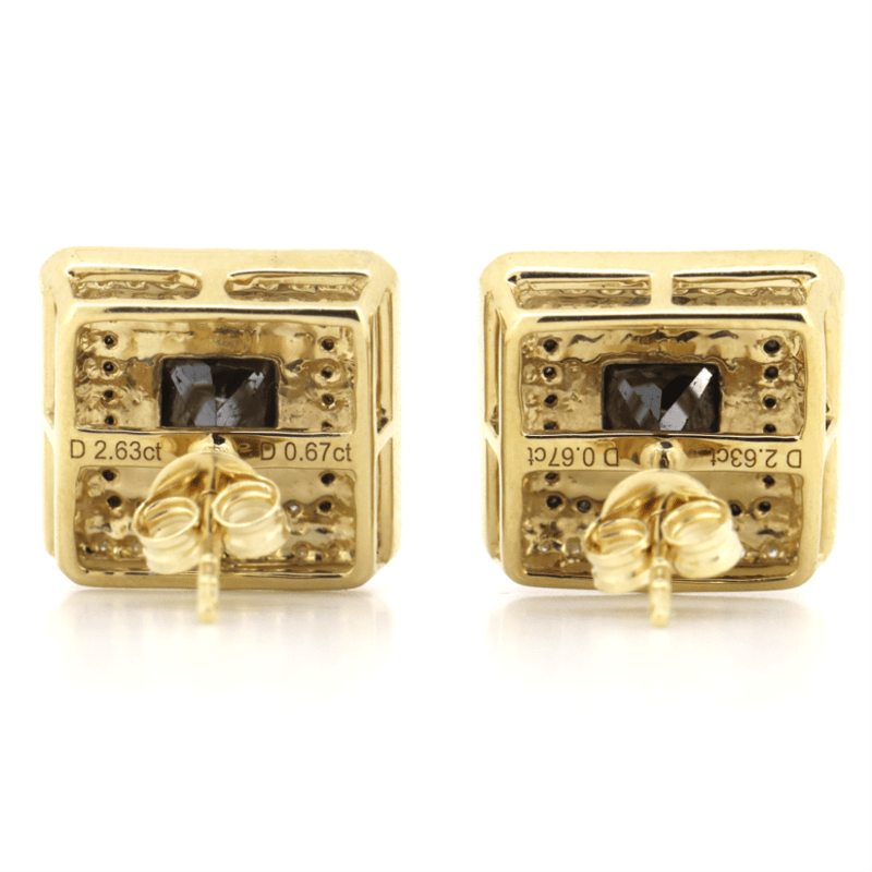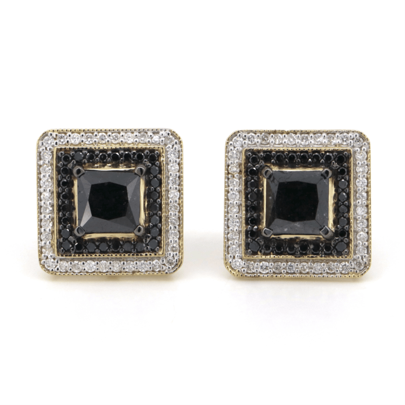 14K YELLOW GOLD, BLACK DIAMOND AND DIAMOND, DOUBLE HALO STUD EARRINGS. The Centres Feature, 2 Princess Cut, Black, Diamonds (2.63Ct Tdw, Opaque), 4 Claw Basket Set. Surrounding The Centre In The Innermost Halo Are, 56 Round Brilliant Cut, Black, Diamonds (0.33Ct Tdw, Opaque), Bead Set. Surrounding The Centre In The Outermost Halo Are, 72 Round Brilliant Cut, Diamonds (0.34Ct Tdw, H-J Colour, Si1-I2+ Clarity), Bead Set. Valuations Provided by an Independent Third-Party Professional Not Directly Associated With Lloyds Auctions at AUD $$15,300.00 This valuation has been conducted by an independent third-party professional. The valuation amount is an assessment by the issuing valuer and does not reflect the auction value of the item. Any inquiries regarding the valuation should be directed to the issuing valuer (refer to contact details on the certificate), as Lloyds Auctions has no affiliation or influence over the valuation, the valuer, or the stated amount. Condition: Good - Refer Images 0 +324