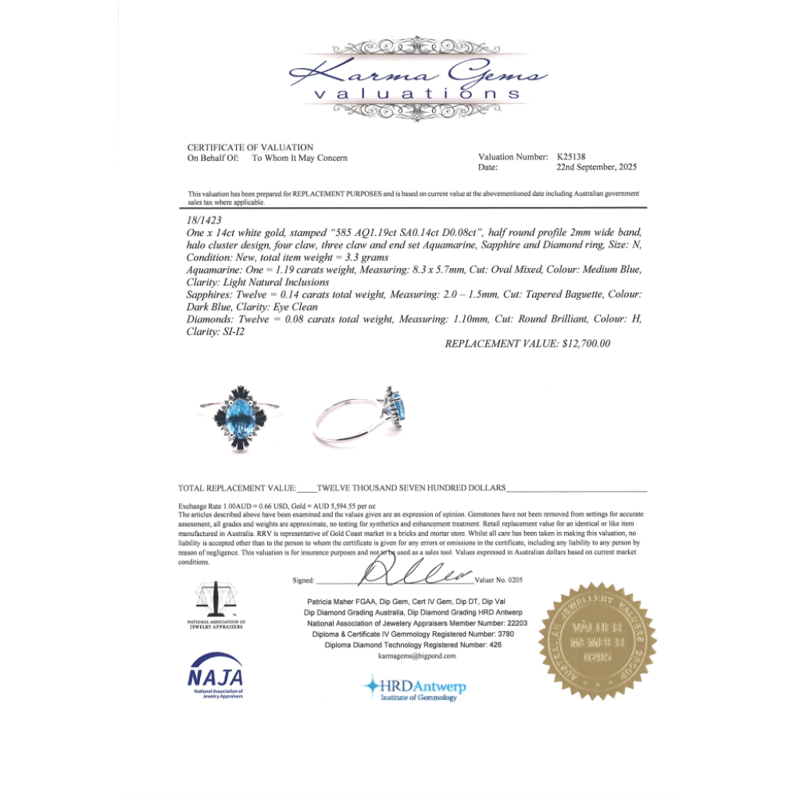 14K WHITE GOLD, AQUAMARINE, BLUE SAPPHIRE AND DIAMOND, DRESS RING. The Centre Features, One Oval Cut, Medium Blue, Aquamarine (1.19Ct, Light Natural Inclusions), 4 Claw Set. Surrounding The Centre Are, 12 Tapered Baguette Cut, Dark Blue, Sapphires (0.14Ct Tsw, Eye Clean Clarity), And 12 Round Brilliant Cut, Diamonds (0.08Ct Tdw, H Colour, Si-I2 Clarity), Claw/ Bead Set. Ring Size N. Valuations Provided by an Independent Third-Party Professional Not Directly Associated With Lloyds Auctions at AUD $$12,700.00 This valuation has been conducted by an independent third-party professional. The valuation amount is an assessment by the issuing valuer and does not reflect the auction value of the item. Any inquiries regarding the valuation should be directed to the issuing valuer (refer to contact details on the certificate), as Lloyds Auctions has no affiliation or influence over the valuation, the valuer, or the stated amount. Condition: Good - Refer Images 0 +327