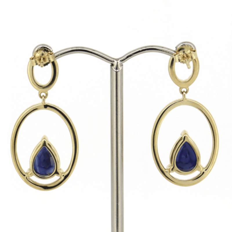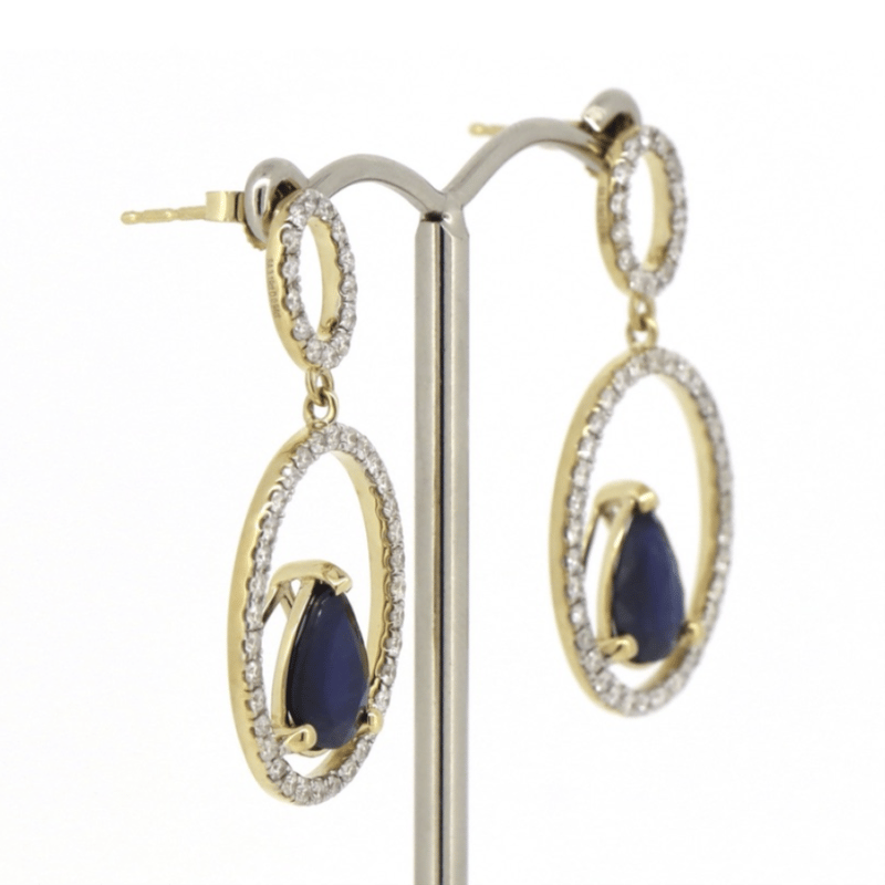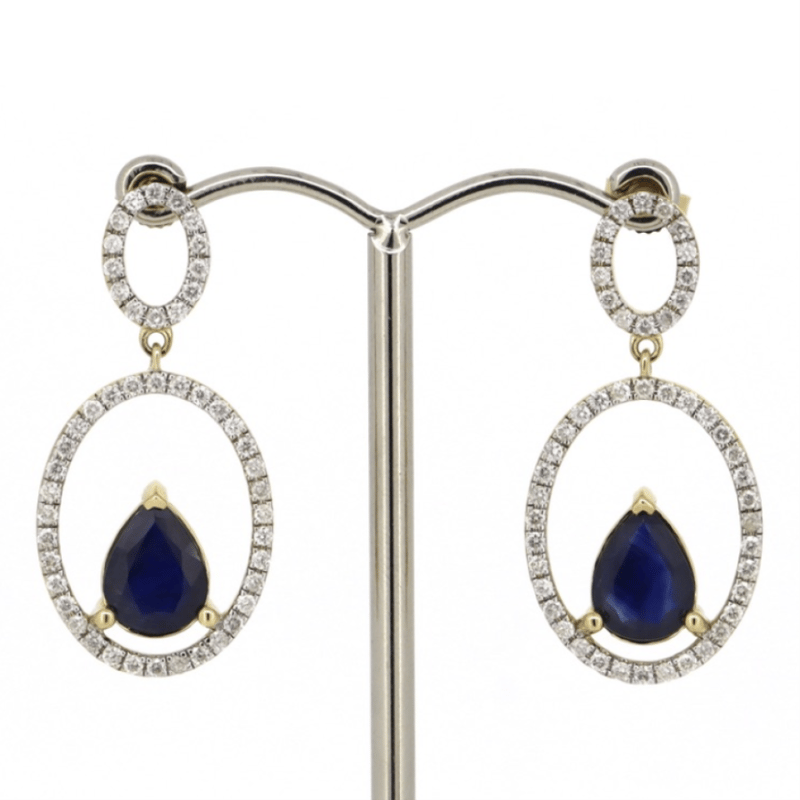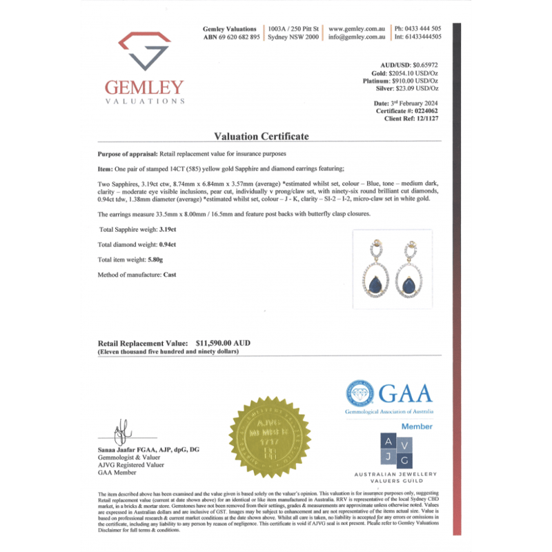 14K YELLOW GOLD, BLUE SAPPHIRE AND DIAMOND, DOUBLE HOOP DROP EARRINGS. The Design Features, 2 Pear Cut, Medium Dark Blue, Sapphires (3.19Ct Tsw, Moderate Eye Visible Inclusions), 3 Claw Set. Decorating The Design In Double Oval Hoops Are, 96 Round Brilliant Cut, Diamonds (0.94Ct Tdw, J-K Colour, Si2-I2 Clarity), Micro-Claw Set In White Gold. The Earrings Have Post Backs, With 14K Yellow Gold Butterfly Clasps. Valuations Provided by an Independent Third-Party Professional Not Directly Associated With Lloyds Auctions at AUD $$11,590.00 This valuation has been conducted by an independent third-party professional. The valuation amount is an assessment by the issuing valuer and does not reflect the auction value of the item. Any inquiries regarding the valuation should be directed to the issuing valuer (refer to contact details on the certificate), as Lloyds Auctions has no affiliation or influence over the valuation, the valuer, or the stated amount. Condition: Good - Refer Images 0 +335