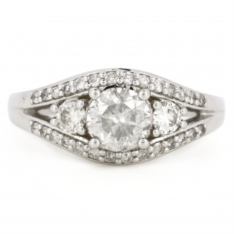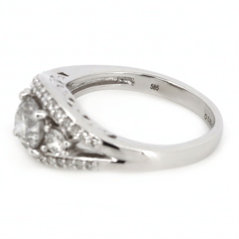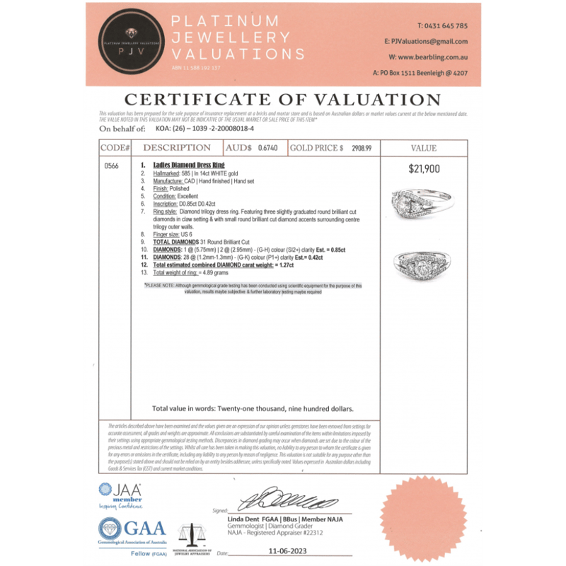 14K WHITE GOLD AND DIAMOND, TRILOGY RING. The Design Features, 3 Round Brilliant Cut, Diamonds (0.85Ct Tdw, G-H Colour, Si2+ Clarity), Claw Set. Bordering The Design Are, 28 Round Brilliant Cut, Diamonds (0.42Ct Tdw, G-K Colour, P1+ Clarity), Bead Set. Ring Size L 1/2. Valuations Provided by an Independent Third-Party Professional Not Directly Associated With Lloyds Auctions at AUD $$21,900.00 This valuation has been conducted by an independent third-party professional. The valuation amount is an assessment by the issuing valuer and does not reflect the auction value of the item. Any inquiries regarding the valuation should be directed to the issuing valuer (refer to contact details on the certificate), as Lloyds Auctions has no affiliation or influence over the valuation, the valuer, or the stated amount. Condition: Good - Refer Images 0 +337