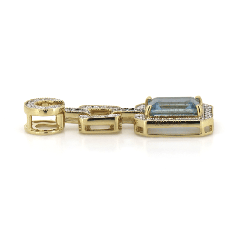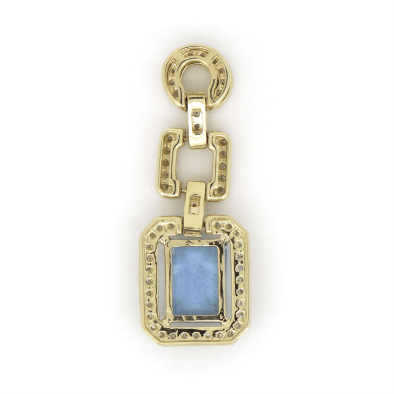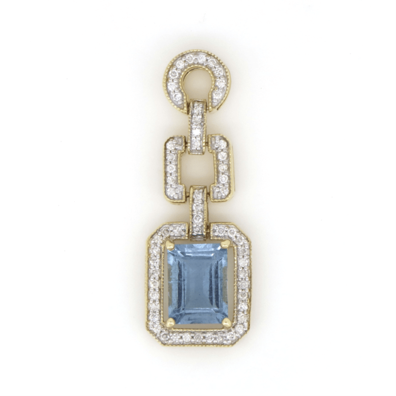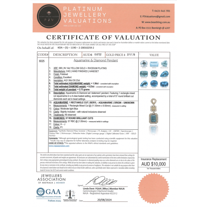 14K YELLOW GOLD, AQUAMARINE AND DIAMOND, DROP PENDANT. The Design Features, One Rectangle Cut, Moderate Light Blue, Aquamarine (1.56Ct, Slightly Included), 4 Claw Set. Encompassing The Design Are, 57 Round Brilliant Cut, Diamonds (0.23Ct Tdw, H-J Colour, P1 Clarity), Bead Set. Valuations Provided by an Independent Third-Party Professional Not Directly Associated With Lloyds Auctions at AUD $$10,000.00 This valuation has been conducted by an independent third-party professional. The valuation amount is an assessment by the issuing valuer and does not reflect the auction value of the item. Any inquiries regarding the valuation should be directed to the issuing valuer (refer to contact details on the certificate), as Lloyds Auctions has no affiliation or influence over the valuation, the valuer, or the stated amount. Condition: Good - Refer Images 0 +343