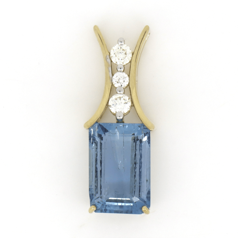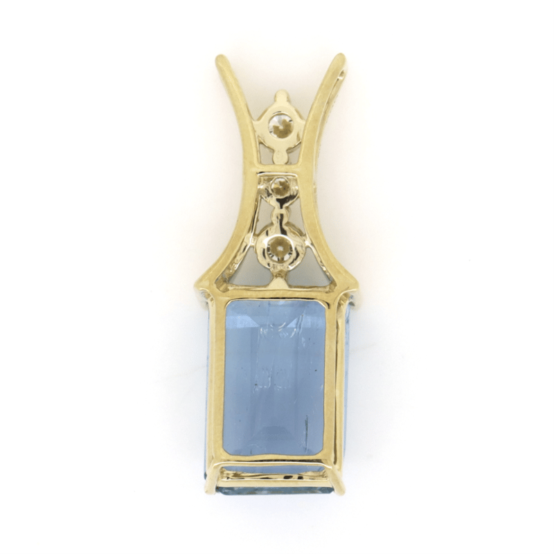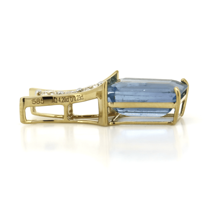 14K YELLOW GOLD, AQUAMARINE AND DIAMOND, PENDANT. The Design Features, One Emerald Cut, Santa Maria Blue, Aquamarine (4.20Ct, Heavy Surface Reaching Inclusions), 4 Claw Set. Encompassing The Design Are, 3 Round Brilliant Cut, Diamonds (0.23Ct Tdw, K-M Colour, Vs-Si1 Clarity), 2 Claw Set. Total Weight 2.4 Grams. Valuations Provided by an Independent Third-Party Professional Not Directly Associated With Lloyds Auctions at AUD $$8,800.00 This valuation has been conducted by an independent third-party professional. The valuation amount is an assessment by the issuing valuer and does not reflect the auction value of the item. Any inquiries regarding the valuation should be directed to the issuing valuer (refer to contact details on the certificate), as Lloyds Auctions has no affiliation or influence over the valuation, the valuer, or the stated amount. Condition: Good - Refer Images 0 +347