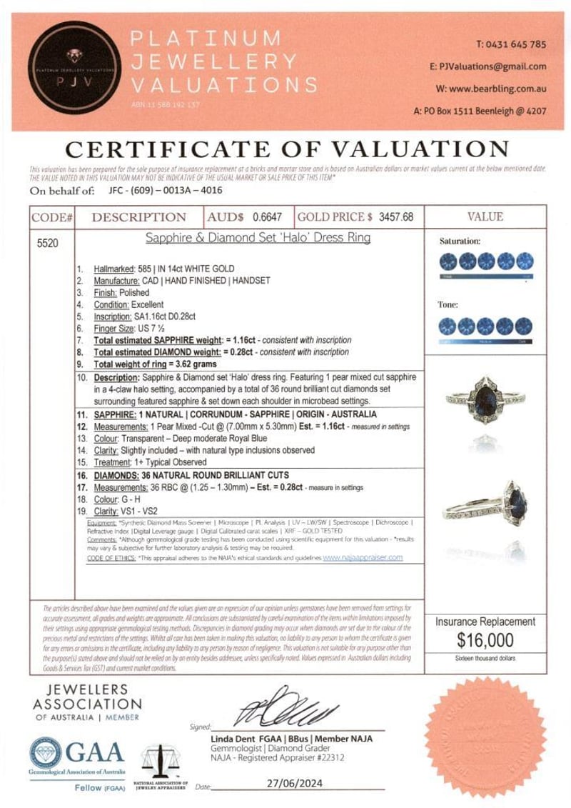 14CT WHITE GOLD AUSTRALIAN SAPPHIRE AND DIAMOND HALO RING Featuring Centre, One Pear Cut, Deep Moderate Royal Blue Australian Sapphire (1.16Ct, Slightly Included), Claw Set, With 36 Round Brilliant Cut Diamonds (0.28Ct Tdw, G-H Colour, Vs1-Vs2 Clarity), Micro-Bead Set. Ring Size O. Valuations Provided by an Independent Third-Party Professional Not Directly Associated With Lloyds Auctions at AUD $16000This valuation has been conducted by an independent third-party professional. The valuation amount is an assessment by the issuing valuer and does not reflect the auction value of the item. Any inquiries regarding the valuation should be directed to the issuing valuer (refer to contact details on the certificate), as Lloyds Auctions has no affiliation or influence over the valuation, the valuer, or the stated amount. Condition: Good - Refer Images 0+1636