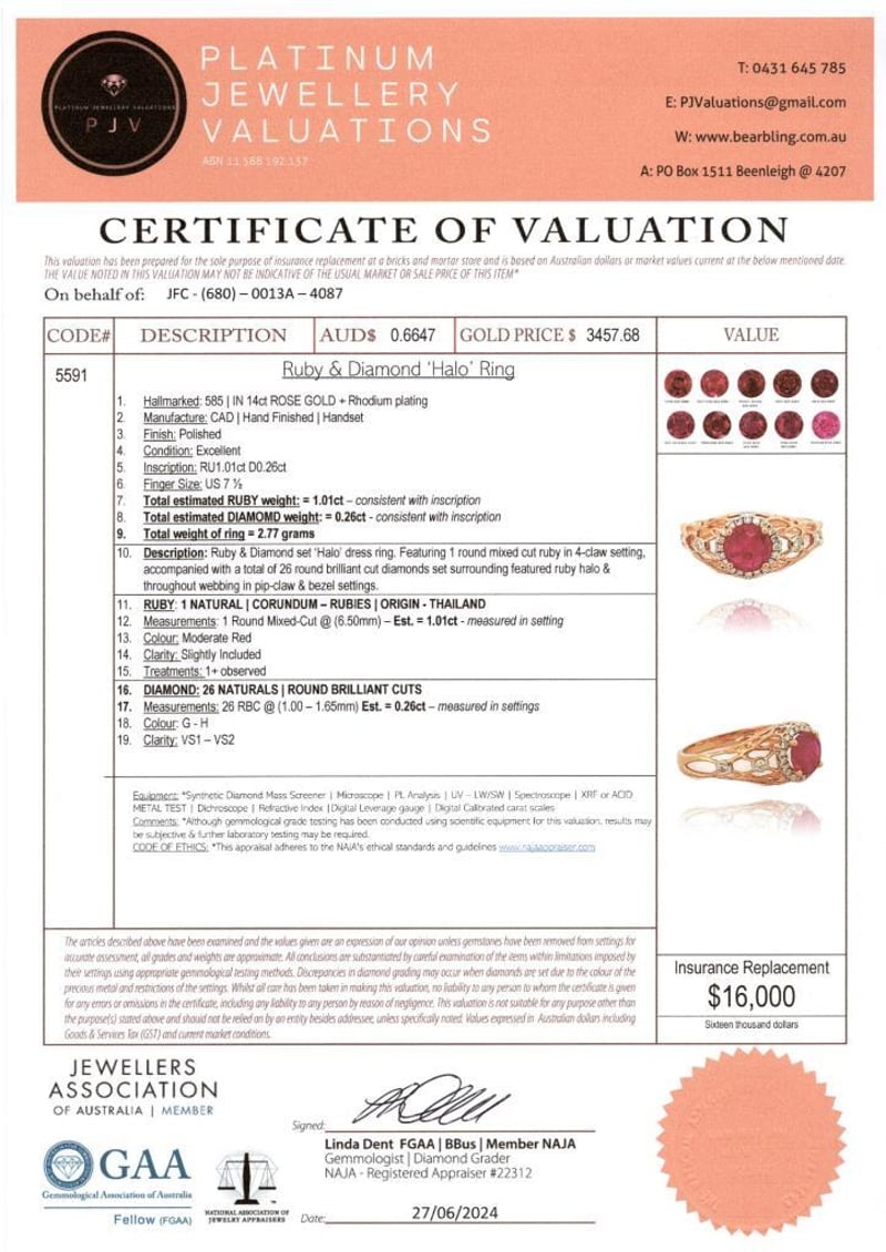 14CT ROSE GOLD RUBY AND DIAMOND DRESS RING Featuring Centre, One Round Cut, Moderate Red Ruby (1.01Ct, Slightly Included), Claw Set, With 26 Round Brilliant Cut Diamonds (0.26Ct Tdw, G-H Colour, Vs1-Vs2 Clarity), Pip Claw/Bezel Set. Ring Size O. Valuations Provided by an Independent Third-Party Professional Not Directly Associated With Lloyds Auctions at AUD $16000This valuation has been conducted by an independent third-party professional. The valuation amount is an assessment by the issuing valuer and does not reflect the auction value of the item. Any inquiries regarding the valuation should be directed to the issuing valuer (refer to contact details on the certificate), as Lloyds Auctions has no affiliation or influence over the valuation, the valuer, or the stated amount. Condition: Good - Refer Images 0+1612