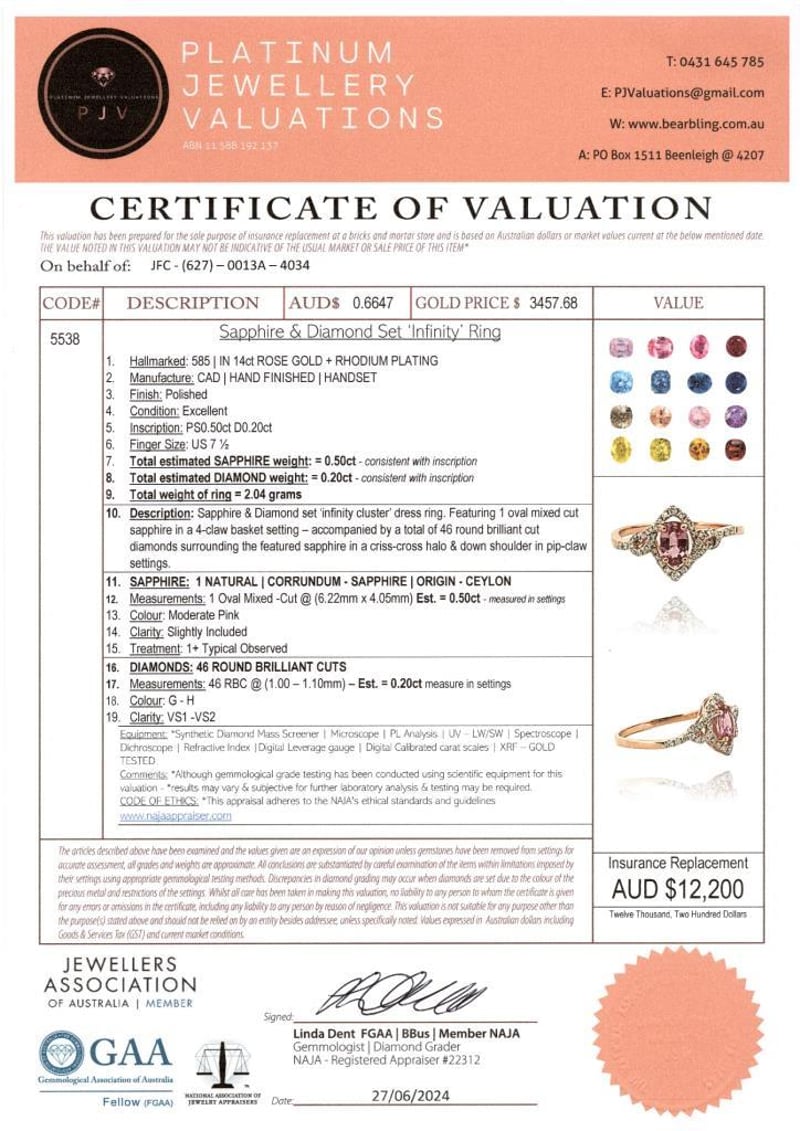 14CT ROSE GOLD PINK CEYLON SAPPHIRE AND DIAMOND HALO RING Featuring Centre, One Oval Cut, Moderate Pink Ceylon Sapphire (0.50Ct, Slightly Included), Claw Set, With 46 Round Brilliant Cut Diamonds (0.20Ct Tdw, G-H Colour, Vs1-Vs2 Clarity), Pip-Claw Set. Ring Size O. Valuations Provided by an Independent Third-Party Professional Not Directly Associated With Lloyds Auctions at AUD $12200This valuation has been conducted by an independent third-party professional. The valuation amount is an assessment by the issuing valuer and does not reflect the auction value of the item. Any inquiries regarding the valuation should be directed to the issuing valuer (refer to contact details on the certificate), as Lloyds Auctions has no affiliation or influence over the valuation, the valuer, or the stated amount. Condition: Good - Refer Images 0+1645