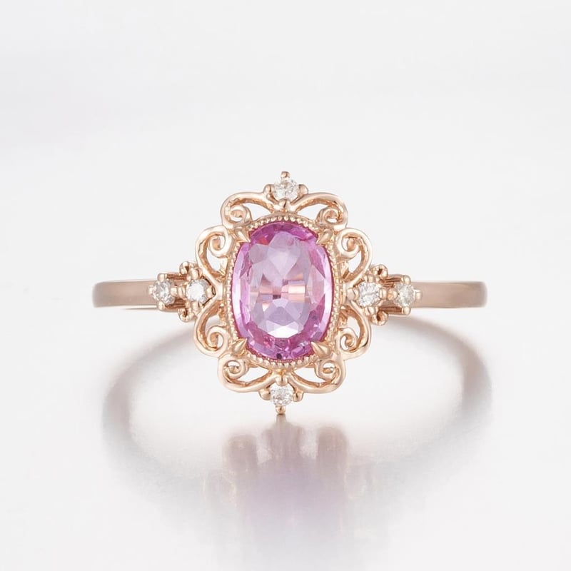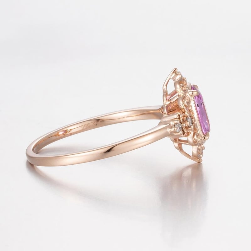 14CT ROSE GOLD PINK CEYLON SAPPHIRE AND DIAMOND ANTIQUE INSPIRED RING