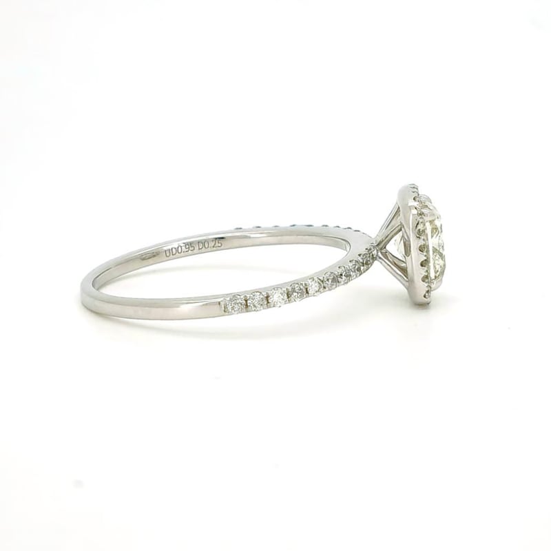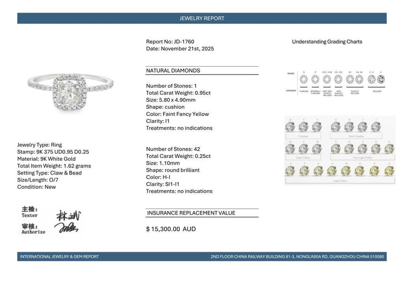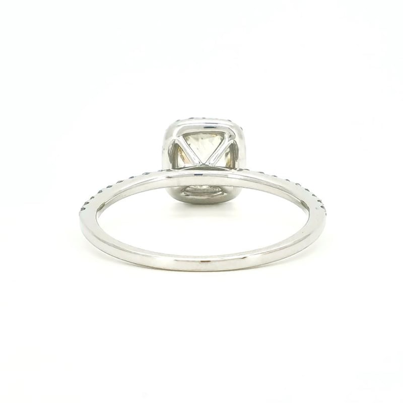 9CT WHITE GOLD DIAMOND HALO RING Featuring Centre, One Cushion Cut, Faint Fancy Yellow Diamond (0.95Ct, I1 Clarity), Claw Set, With 42 Round Brilliant Cut Diamonds (0.25Ct Tdw, H-I Colour, Si1-I1 Clarity), Bead Set. Ring Size O. Valuations Provided by an Independent Third-Party Professional Not Directly Associated With Lloyds Auctions at AUD $15300This valuation has been conducted by an independent third-party professional. The valuation amount is an assessment by the issuing valuer and does not reflect the auction value of the item. Any inquiries regarding the valuation should be directed to the issuing valuer (refer to contact details on the certificate), as Lloyds Auctions has no affiliation or influence over the valuation, the valuer, or the stated amount. Condition: Good - Refer Images 0586317+1667